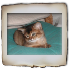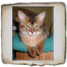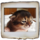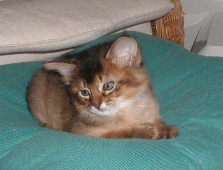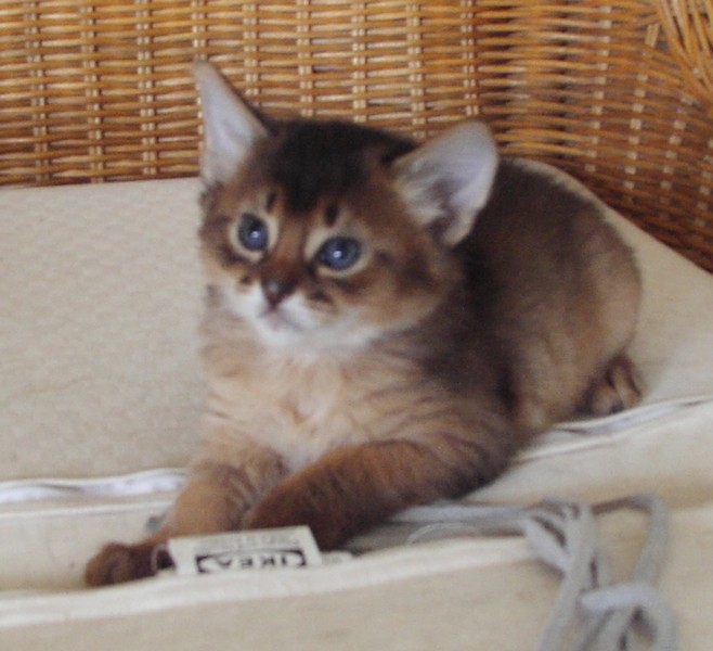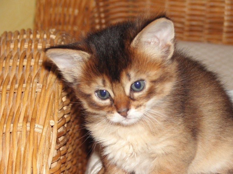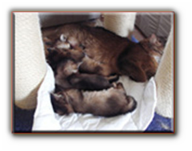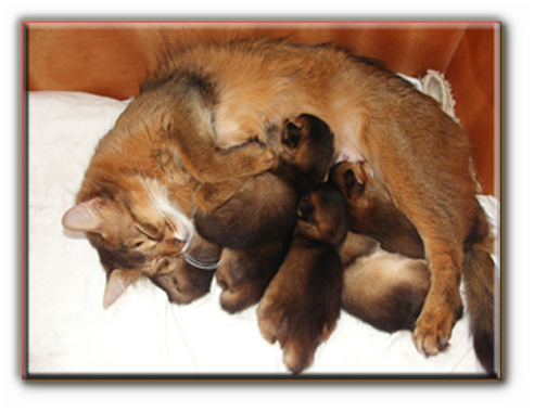 Aileen hatte es Gott sei Dank nicht eilig die Babys aus der Wurfkiste zu holen. Ich glaube, sie hat geahnt, dass es stressig wird, wenn sie die Gegend unsicher machen. Chelsea hat nach vier Wochen mal neugierig über den Rand der Kiste gelugt, der zugegebenermaßen recht hoch ist, und fand es ab sofort grottenlangweilig in der Kiste. Sie mühte sich nicht lange und war dann, unter den wachsamen Augen von Mama Aileen, über den Rand geklettert. Kaum war Chelsea draußen, lugten 5 Somaliköpfchen mit empörten Blicken über den Rand und Chinook stimmte ein Geschrei an: "Ich will auch, ich will auch!" Chandro mühte sich dann aus Leibeskräften, um ebenfalls über den Rand zu kommen....und schaffte es auch. Bei allen anderen hab ich den Verdacht, dass Aileen sie dann rausgeholt hat, denn das hab ich nicht mitbekommen, weil ich zwischenzeitlich das Zimmer verlassen hatte und als ich dann zurück war, wuselten alle Sechse durch die Gegend und Mama Aileen gurrend hinterher. Das Lager hat sie dann für ihre Kleinen unterm Kratzbaum aufgeschlagen. Schlaue Aileen, so lernen die Kleinen schnell, wofür ein Kratzbaum gut ist.