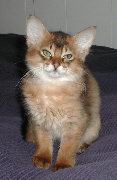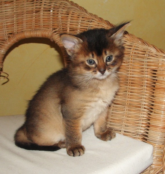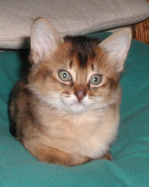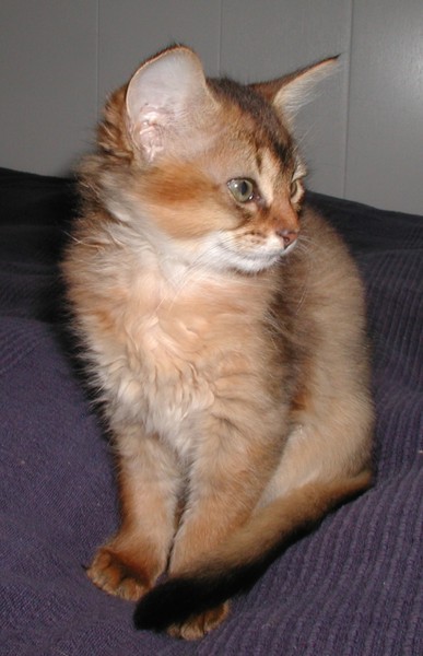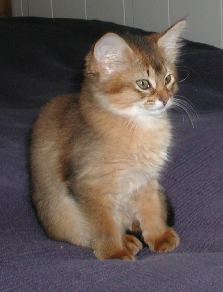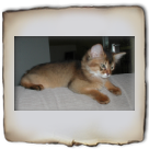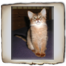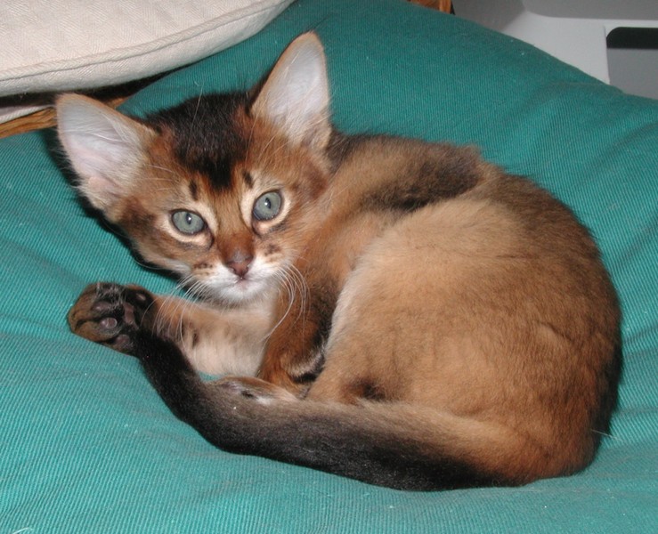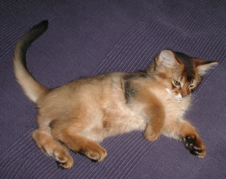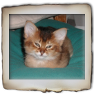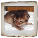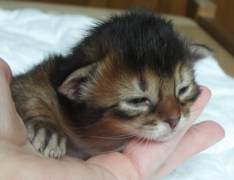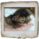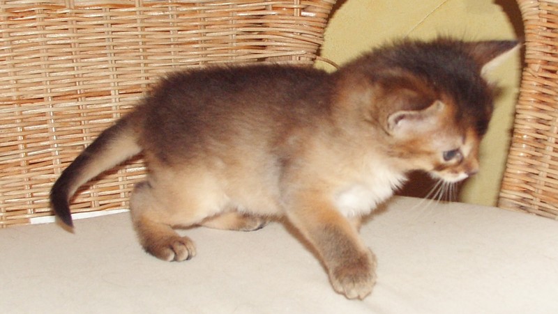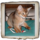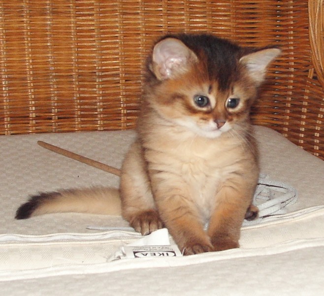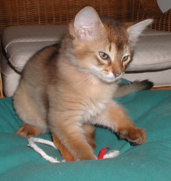 Mit 10 1/2 Wochen sind die Süßen beim Spiel nicht mehr unterzukriegen. Man versuche mal 6 Somalikitten müde zu spielen. Nach ca. 2 Stunden habe ich dann aufgegeben. Es wurde hin und her gelaufen, gesprungen, Kratzbaum rauf und wieder runter. Als Spielzeug hatte ich nur ein paar Softbälle und eine Angel mit einer Fellmaus am Ende. Da spielte es keine Rolle, dass ein Türpfosten im Weg ist, ob ein Geschwisterchen den Weg kreuzt. Es wurde hoch in die Luft gesprungen, egal, wie man wieder landet, die blauen Flecken sieht man unter dem Fell ja nicht, Kapriolen dabei geschlagen. Und wurde die Maus dann doch mal gefangen, denn fix sind sie ja, dann wurde sie knurrend verteidigt. Und wenn man dann doch mal außer Atem war, wurde sich ein halbes Minütchen ausgeruht und weiter ging es dann.