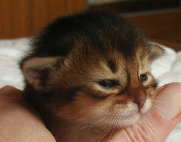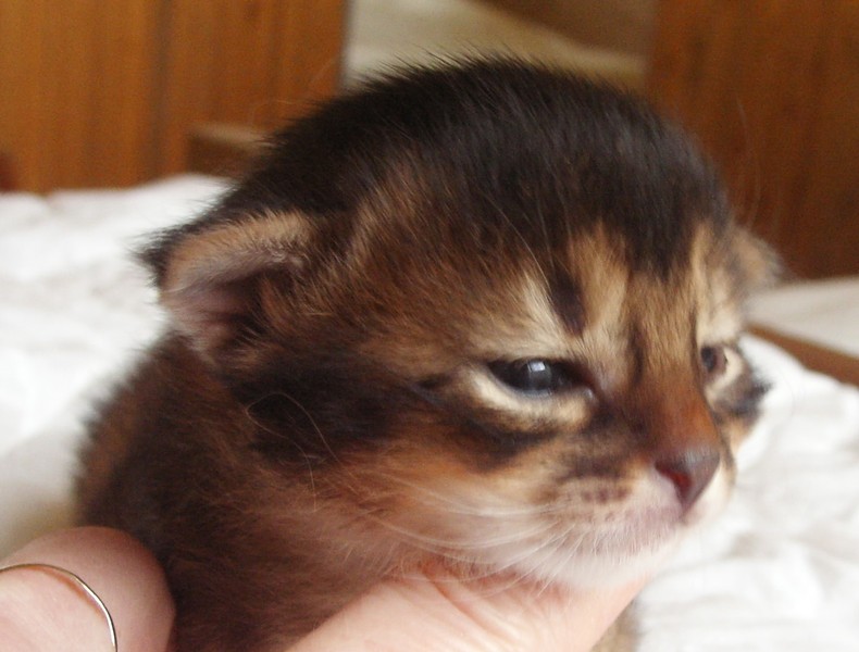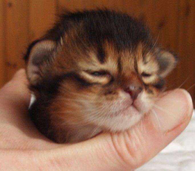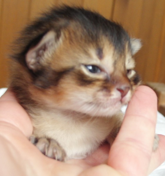 Chandro, unser Erstgeborener und der Schwerste, verteidigt nach wie vor sein Gewicht problemlos. Ein richtiger Wonneproppen. Nach 5 Wochen und 1 Tag wiegt er 695 g. Dabei ist er sehr agil und munter und geht auch keiner Rauferei aus dem Weg. Und schlau ist er noch obendrein. Wenn er etwas nicht schafft, dann überlegt er sich, wie er auf anderen Wegen an sein Ziel kommt.