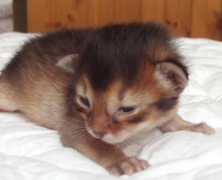 Chinook ist unser zartes Pflänzchen. Der leichteste Kater des Wurfes und will es auch unbedingt bleiben. Irgendwann zwischen der 5. und der 8. Woche hat er sich das aber überlegt und war dann der Meinung, jetzt mal ordentlich zulegen zu müssen. Mittlerweile hat er die Mädchen überrundet und steht nun an der vierten Stelle in der Gewichtsliste.