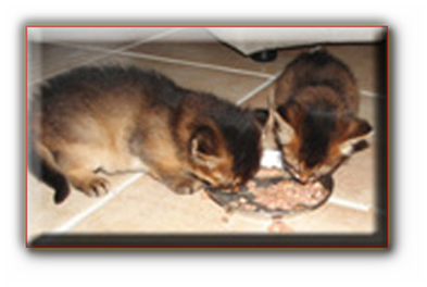 Chandro, unser Moppel, hat dann auch schnell zur Fütterungszeit mitbekommen, dass es außer an der Milchbar noch andere Möglichkeiten gibt, um satt zu werden und hat an Aileens Napf kräftig zugeschlagen. Die Anderen ließen sich noch gut eine halbe Woche Zeit und nach und nach wurde der Kreis an den Näpfen immer größer. Am Ende der fünften Woche fraßen alle mit Appetit leckeres BARF. Damit aber nicht im neuen Zuhause das große Umstellen und Umgewöhnen beginnt, bekommen die Kleinen auch direkt von Anfang an Nassfutter aus der Dose und sowieso immer ein paar Krümel Trockenfutter über das Rohfleisch gestreut. Im Prinzip sind sie also bei Abgabe "Allesfresser". Bis jetzt gab es auch noch keinerlei Protest. Es wird gefressen, was in den Napf kommt. Mal bei der einen Mahlzeit mehr, mal weniger, aber bisher war noch keiner dabei, der irgendwas verweigert hat.