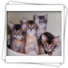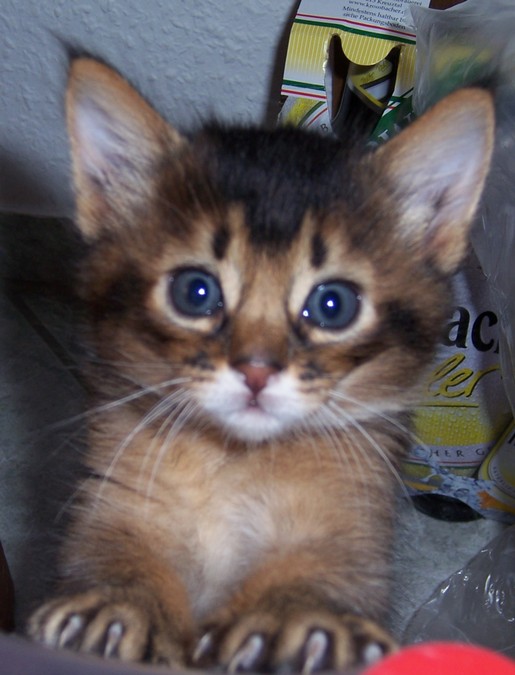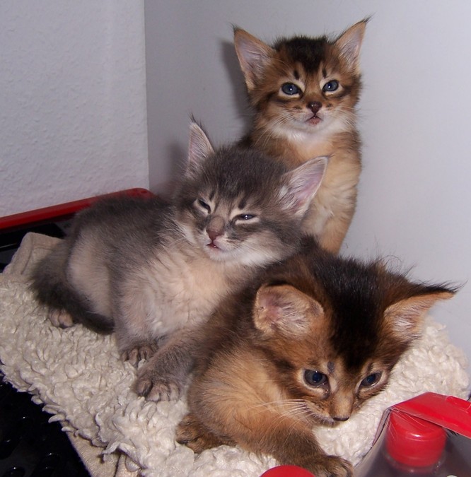 Mit vier Wochen begann ich dann die ersten Fleischmahlzeiten anzubieten. Erst nur zögerlich, dann aber mit mehr und mehr Appetit wurden diese akzeptiert. Mit Einführung der Fleischmahlzeiten setzte ich die Kleinen auch schon auf die Katzenklos. Der Kater, ein ganz Schlauer, hatte es sofort begriffen. Er setzte sich sofort hin und pieselte einen kleinen Knödel. Die kleine Blaue machte es ihm nach, während die wildfarbenen Mädels erst mal nur darin spielten. Aber auch bei ihnen dauerte es maximal einen Tag, da war es begriffen.