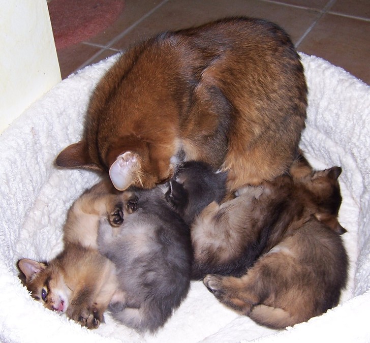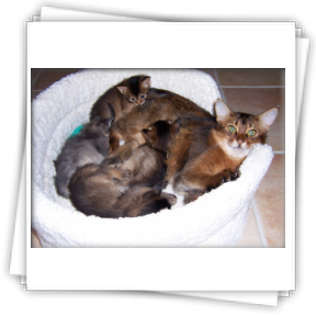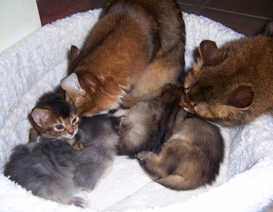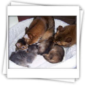 Leider nahmen die Babys nicht so gut zu, wie ich es von den vorherigen Würfen gewohnt war. Der Kater und das blaue Mädchen machten mir keine Sorgen, aber die beiden wildfarbenen Mädchen hingen arg hinterher. Erschwerend kam hinzu, dass das eine Mädchen dummerweise auch noch die Zitze des Katers mitangesaugt hatte, also keine eigene Zitze hatte. Aber sie war da gar nicht wählerisch, sie bediente sich auch an den Zitzen der beiden anderen Mädels. Als die Babys 2 Wochen und drei Tage alt waren, passierte es dann. Glady hatte eine richtig dicke Gesäugeentzündung. Mittags war noch alles in Ordnung und abends hatte sie 41,2 ° Temperatur. Das war natürlich ein gehöriger Schock und darauf vorbereitet war ich nicht. So gut es ging versuchte ich die Babys mit Ersatzmilch zu füttern, aber das stieß auf wenig Gegenliebe. Ich telefonierte mit verschiedenen Züchtern, die mir alle mit Rat und Tat zur Seite standen und möchte mich an dieser Stelle ganz herzlich bei Petra Bogut, Heike Cyris, Ina Fröhlich, Sylvie Groenveld und Irene Kessler bedanken, deren wertvolle Tipps und seelische Unterstützung mir sehr weitergeholfen haben. Petra schickte mir dann sofort ein paar Silikonsauger, die auf Einwegspritzen passen und siehe da, die wurden lieber genommen, als die Sauger, die ich hier hatte. Von da ab klappte dann das Füttern mit der Ersatzmilch. Leider schlug die Behandlung mit dem Antibiotikum allein bei Glady nicht so gut an. Sie war nicht in der Lage ihre Babys zu versorgen und so erbarmte sich Aileen der Kleinen und adoptierte sie. Den Babys war es recht, Hauptsache Fell, an das man sich kuscheln konnte. Auch Carry übt schon fleißig die Mutterrolle. Abwechselnd liegen Aileen und sie bei den Babys und versorgen sie mit viel Mutterliebe. Aileen ist es aber, die aufpasst, dass sie nicht zu weit laufen, die sie wieder zurückholt in die Kratztonne, wo sie das Lager für die Kleinen aufgeschlagen hat. Carry ist mehr dann fürs Spielen zuständig, die den Kleinen allen möglichen Unsinn beibringt ;-