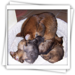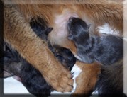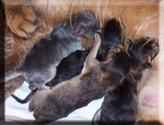 Am 09.09.2006, pünktlich am 65. Tag der Schwangerschaft, weckte mich Glady morgens zwischen drei und vier Uhr. Sie lag neben meinem Kopfkissen und stöhnte mir die ersten Wehen ins Ohr. Ich war sofort wach, stand auf und holte alle notwendigen Utensilien. Als ich zurück kam, sprang sie ganz freiwillig in die Wurfkiste, die sie bei den vorherigen Geburten nur mit viel Überredungskunst akzeptiert hatte. Ich hatte mich schon auf einen neuerlichen Überredungs-
