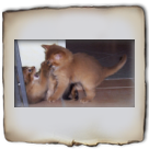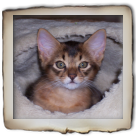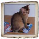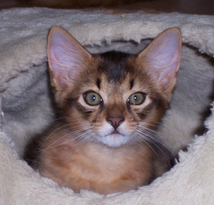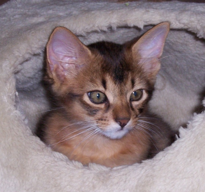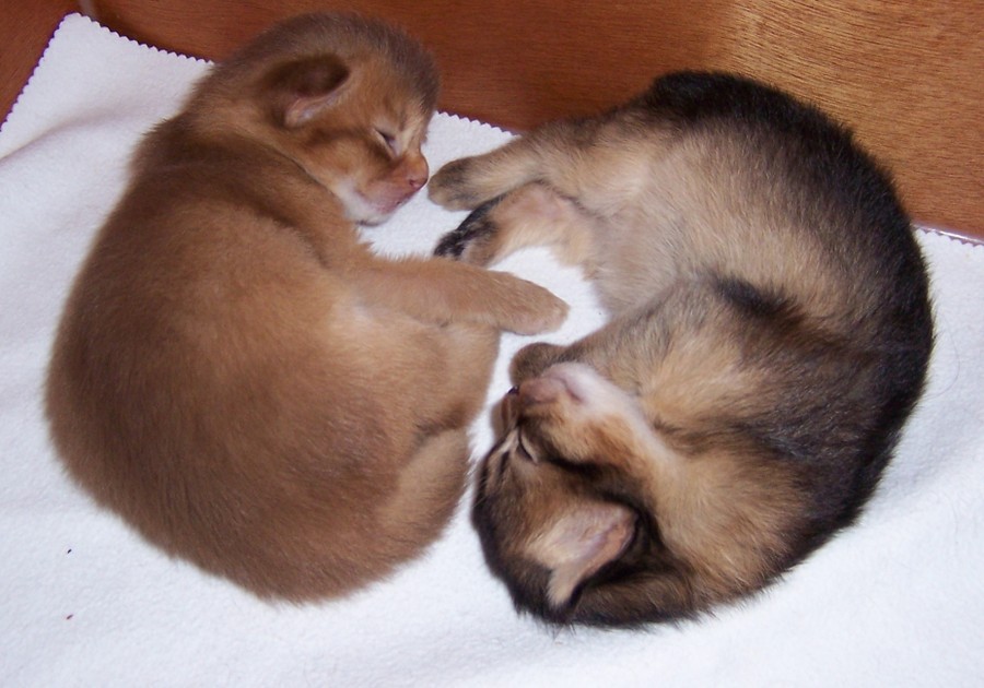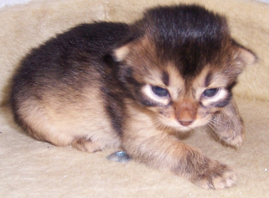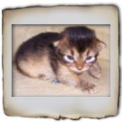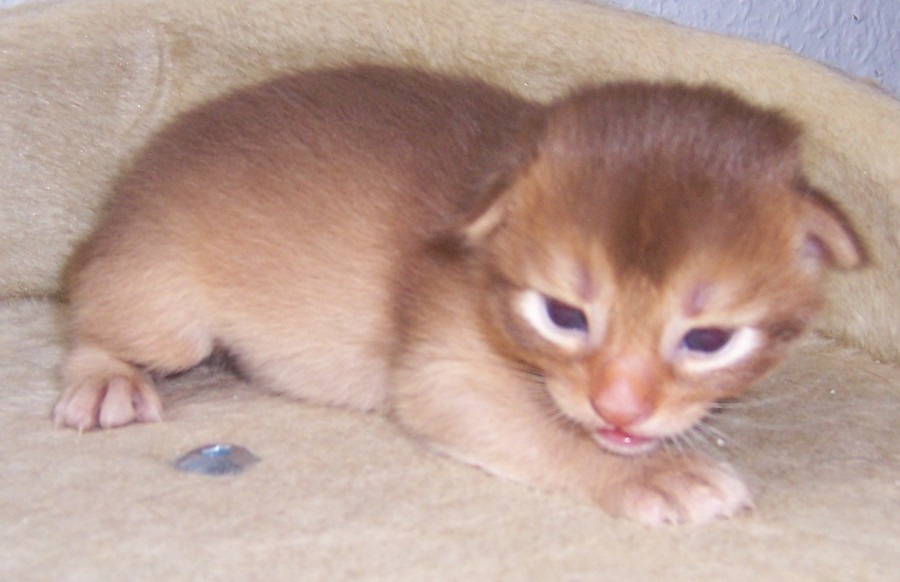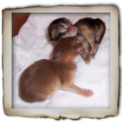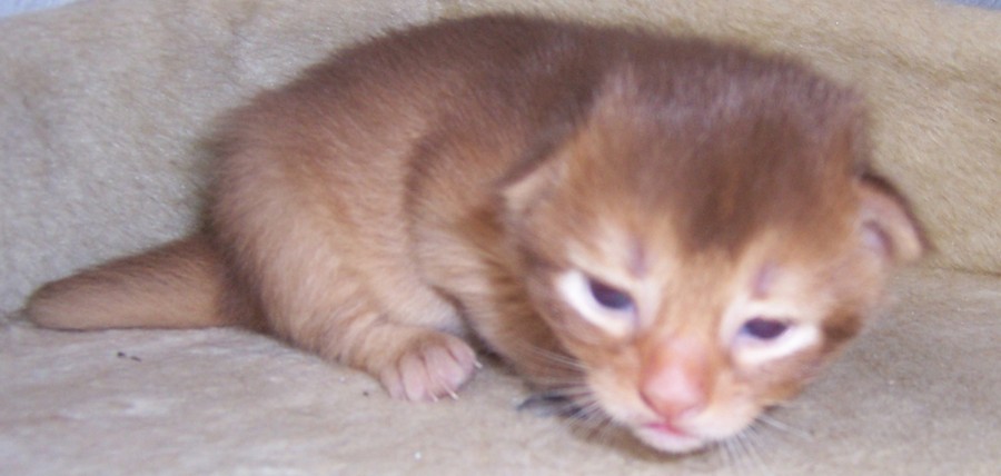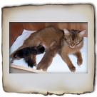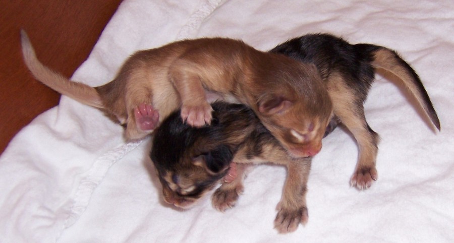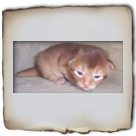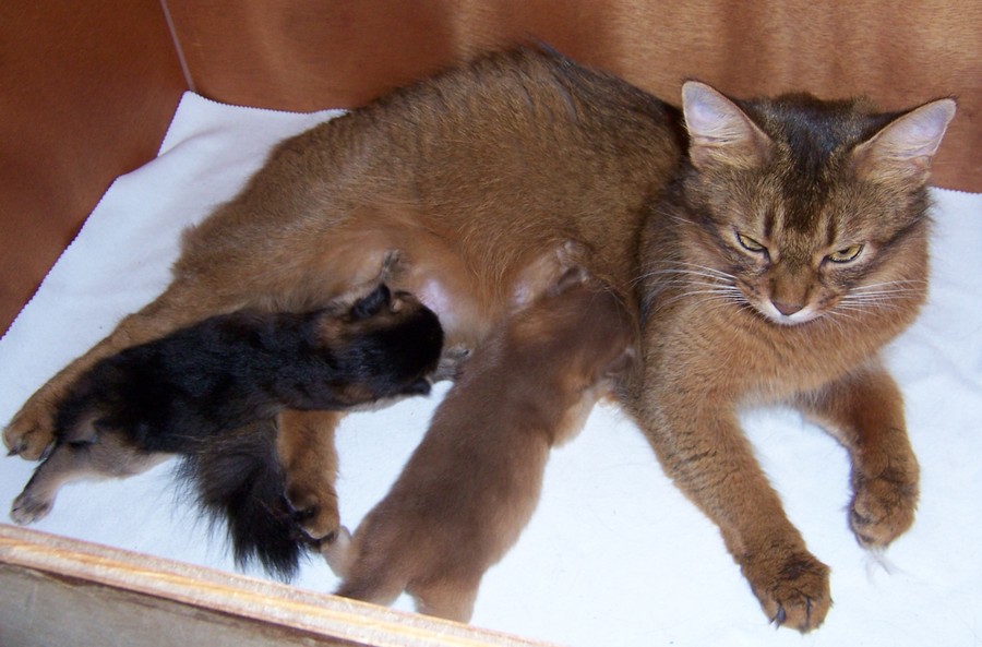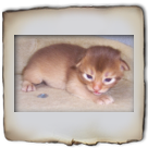 Unsere Darcy hat es mal wieder ein wenig spannend gemacht und leider lief auch nicht alles normal. Eigentlich war der errechnete Geburtstermin der 28.07., aber Darcy dachte nicht daran pünktlich zu sein. Wenigstens war es diesmal nur einen Tag Verzögerung. Die Babys kamen also am 29.07.2009 zur Welt. Morgens sagte sie mir schon Bescheid, dass es losgeht, aber es tat sich nicht wirklich was. Sie sprang in die Kiste rein und wieder raus und war recht nervös. Es zog sich bis zum Nachmittag hin und um 17.03 Uhr kam dann endlich das erste Kitten zur Welt. Leider hatte es einen offenen Bauch und musste eingeschläfert werden. Um 17:51 Uhr kam dann ein kleiner wildfarbener Kater zur Welt. Ganz normal und gesund. Darcy stürzte sich auf die Nachgeburt. Ich durfte das Baby abnabeln und wiegen. Mit 110 g ein recht ordentliches Gewicht. Um 18.22 Uhr kam Kitten Nr. 3 zur Welt. Ein sorrel Mädchen, ebenfalls gesund und munter und mit 109 g auch ganz schön propper. Und das war es. Damit hat Darcy die Geburt beendet.