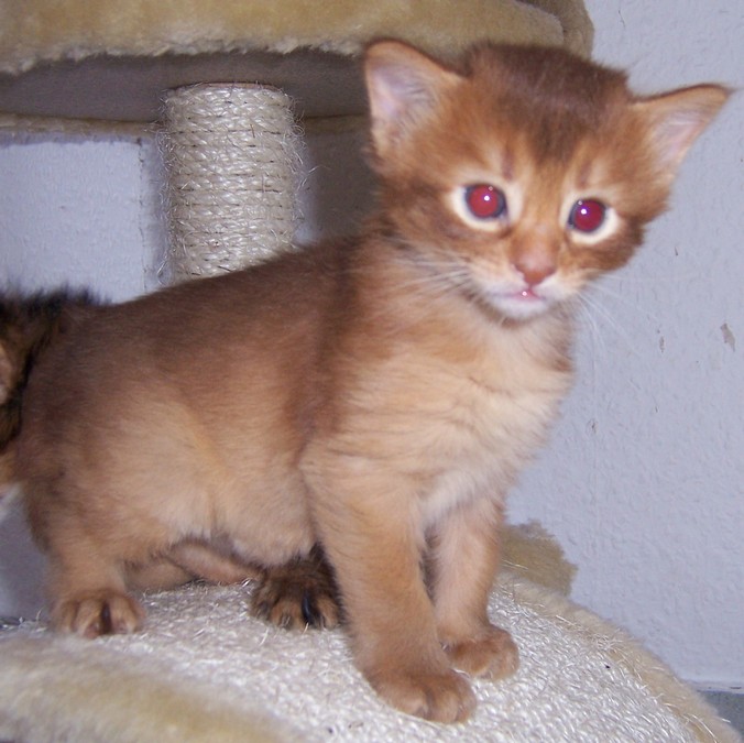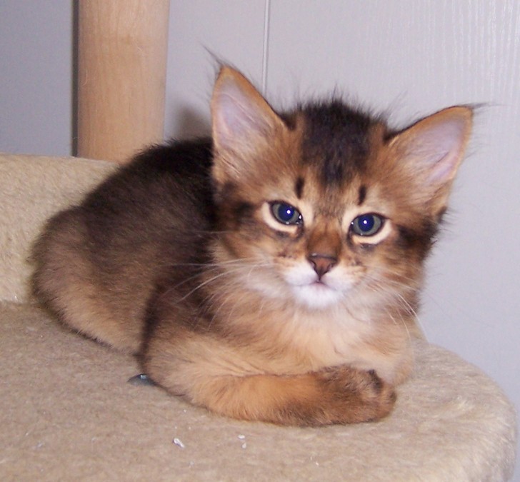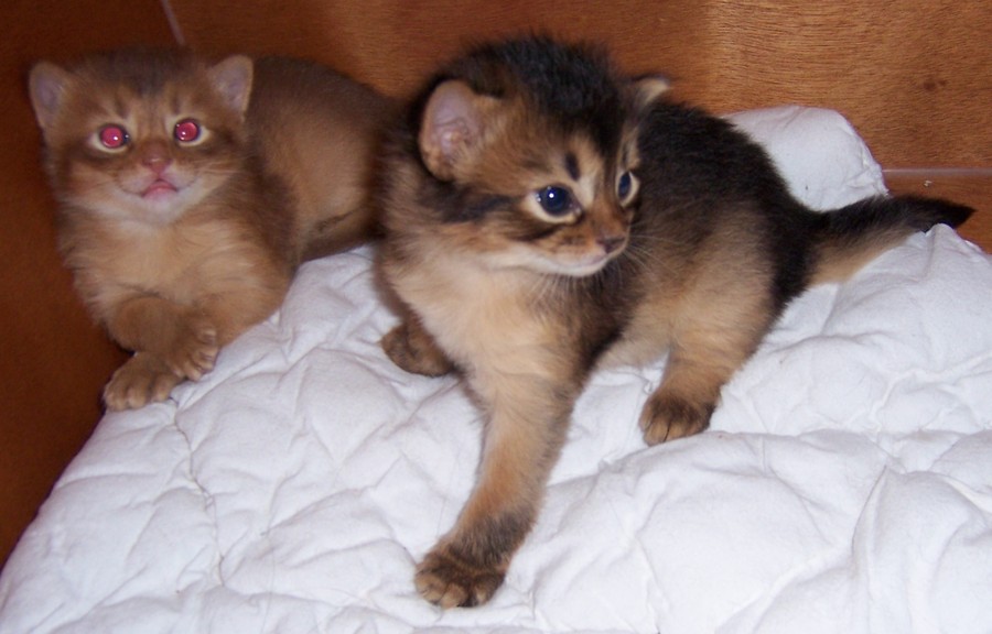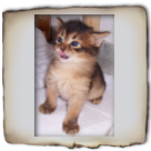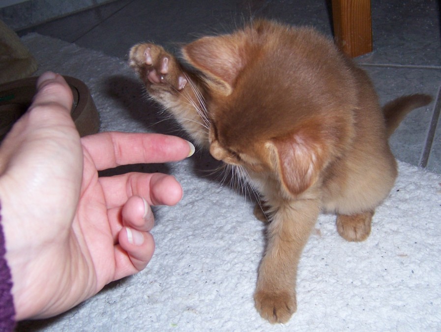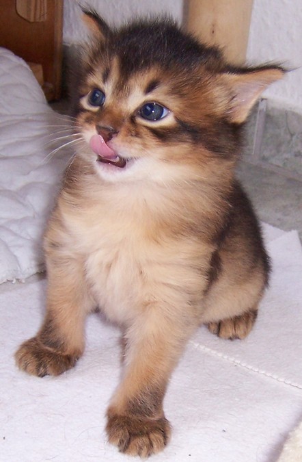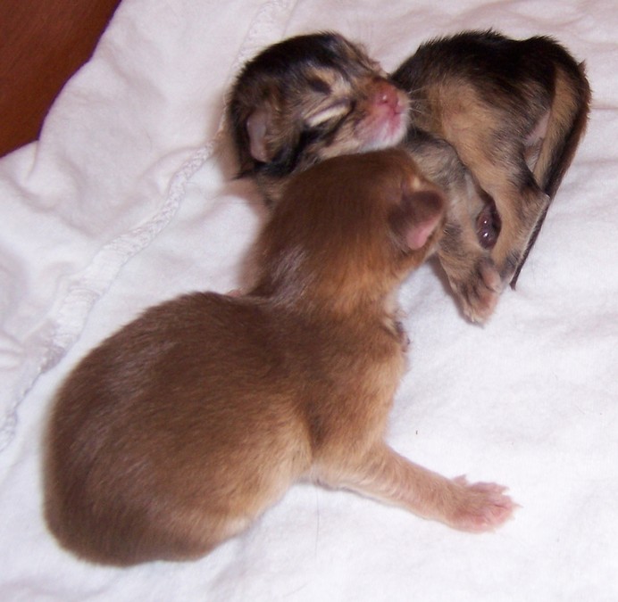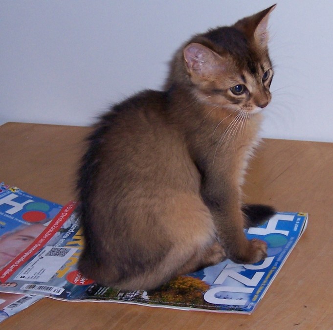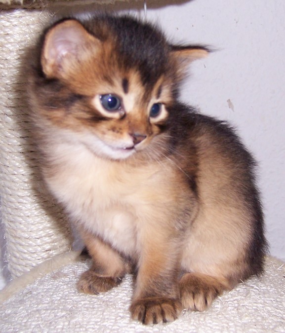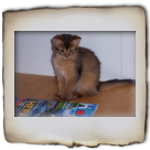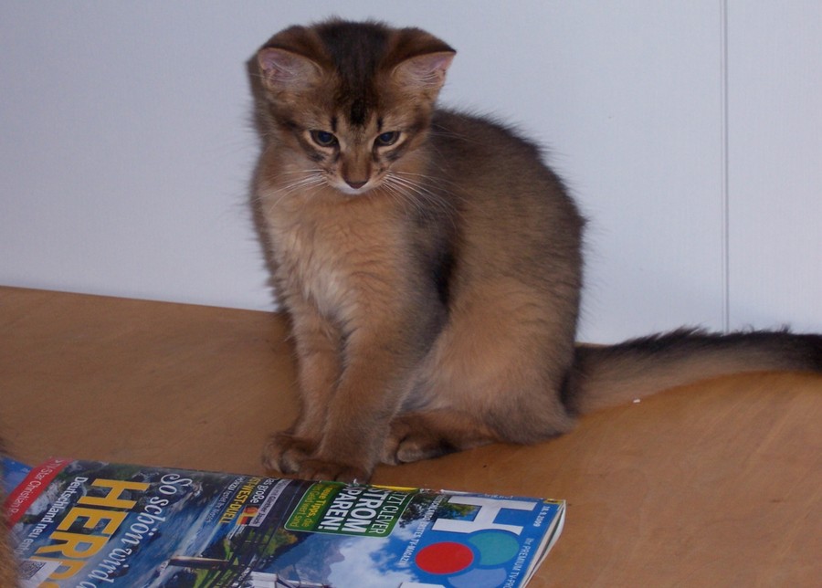 Unsere Darcy hat es mal wieder ein wenig spannend gemacht und leider lief auch nicht alles normal. Eigentlich war der errechnete Geburtstermin der 28.07., aber Darcy dachte nicht daran pünktlich zu sein. Wenigstens war es diesmal nur einen Tag Verzögerung. Die Babys kamen also am 29.07.2009 zur Welt. Morgens sagte sie mir schon Bescheid, dass es losgeht, aber es tat sich nicht wirklich was. Sie sprang in die Kiste rein und wieder raus und war recht nervös. Es zog sich bis zum Nachmittag hin und um 17.03 Uhr kam dann endlich das erste Kitten zur Welt. Leider hatte es einen offenen Bauch und musste eingeschläfert werden. Um 17:51 Uhr kam dann ein kleiner wildfarbener Kater zur Welt. Ganz normal und gesund. Darcy stürzte sich auf die Nachgeburt. Ich durfte das Baby abnabeln und wiegen. Mit 110 g ein recht ordentliches Gewicht. Um 18.22 Uhr kam Kitten Nr. 3 zur Welt. Ein sorrel Mädchen, ebenfalls gesund und munter und mit 109 g auch ganz schön propper. Und das war es. Damit hat Darcy die Geburt beendet.