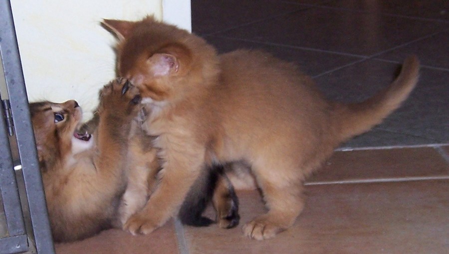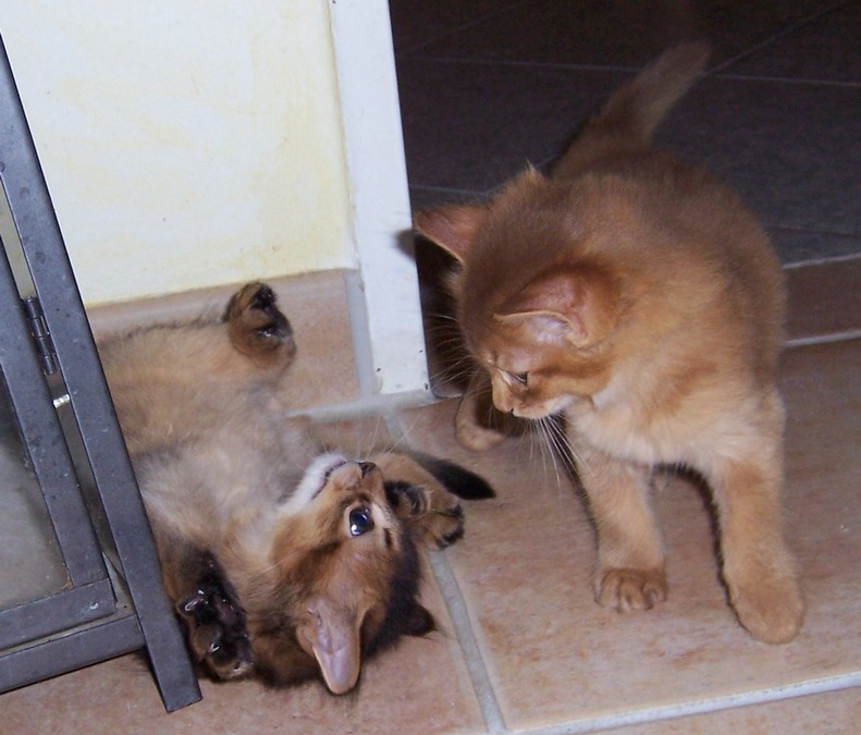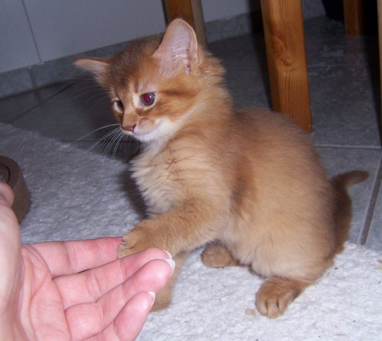 Beide hören auch schon seit einiger Zeit auf ihre Namen. Vielleicht hängt das mit dem Buchstaben "I" zusammen. Vom Schmusen halten die Beiden noch nicht wirklich was. Auf dem Arm nehmen ist auch gaaanz doof.