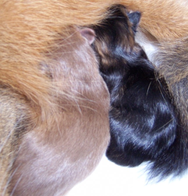 Die ersten beiden Tage ließ die Milchproduktion zu wünschen übrig, die Zunahmen bei den Kitten nur gering. Darcy war mehr damit beschäftigt, die Wurfkiste zu verteidigen, als sich um ihre Babys zu kümmern. Nach dem sie dann aber in einen anderen Raum umgezogen ist und sich nur noch mit ihren Kindern beschäftigte, floss auch die Milch gut und ohne Probleme.