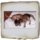 Nun sind die beiden Schnuckelchen schon 12 1/2 Wochen alt. Die Erstimpfung mit 10 Wochen haben beide problemlos überstanden, auch wenn Indi die Fahrt im Kennel wirklich saublöd fand und ständig versuchte auszubrechen.