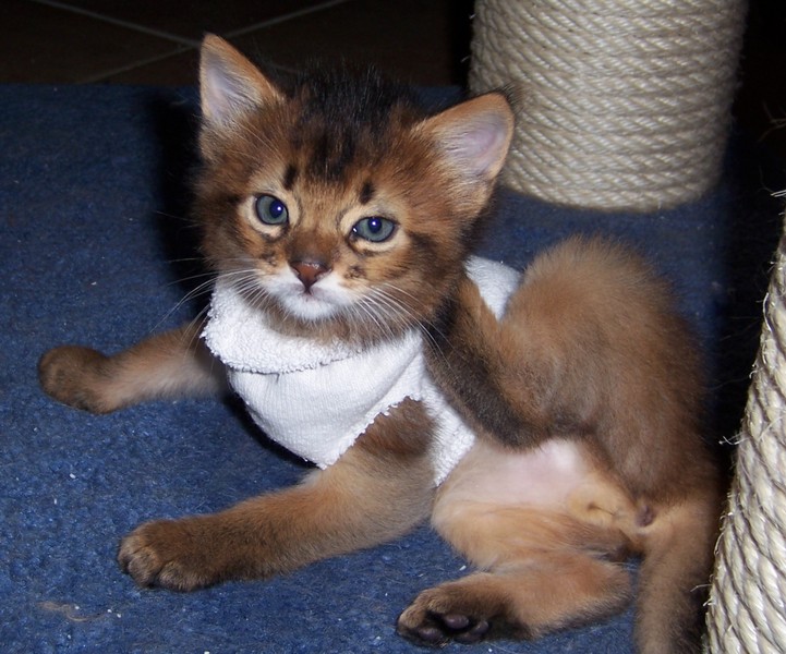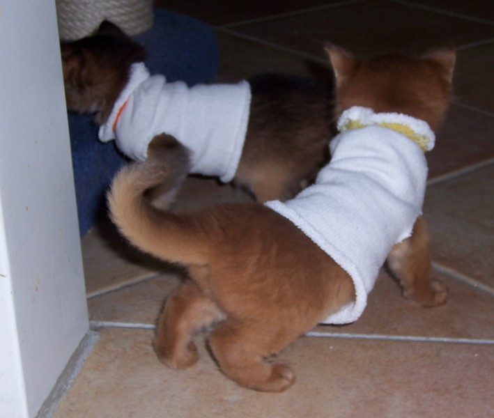 Leider verging die Zeit nicht ganz so problemlos. Mit knapp 5 Wochen merkten wir auf einmal, dass alle Babys wunde Hälse hatten. Enya hat in ihrer Leckwut, den Babys die Hälse blutig geleckt. Da ich Enya irgendwie daran hindern musste, ständig weiter an den wunden Hälsen zu lecken, hab ich den Babys aus alten Socken Bodys geschnitten. Das sah zwar wirklich putzig aus, hatte aber leider nicht ganz so die gewünschte Wirkung. Statt der Bodys legte ich weiche dehnbare dicke Haargummis um die Hälse. Das deckte die wunden Stellen gut ab. Vorher wurde noch dick mit Silberpuder eingestäubt.