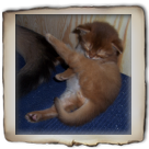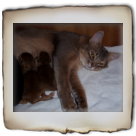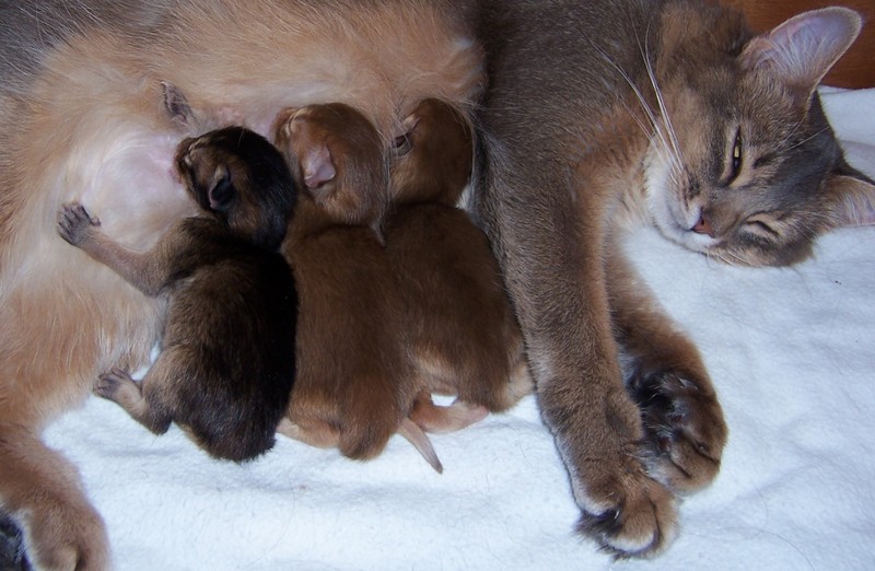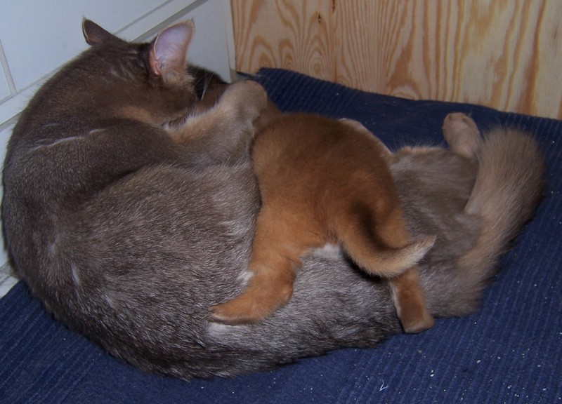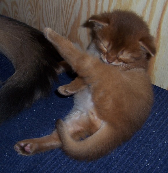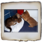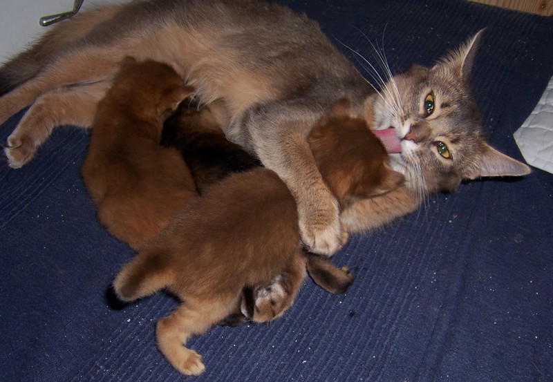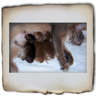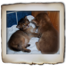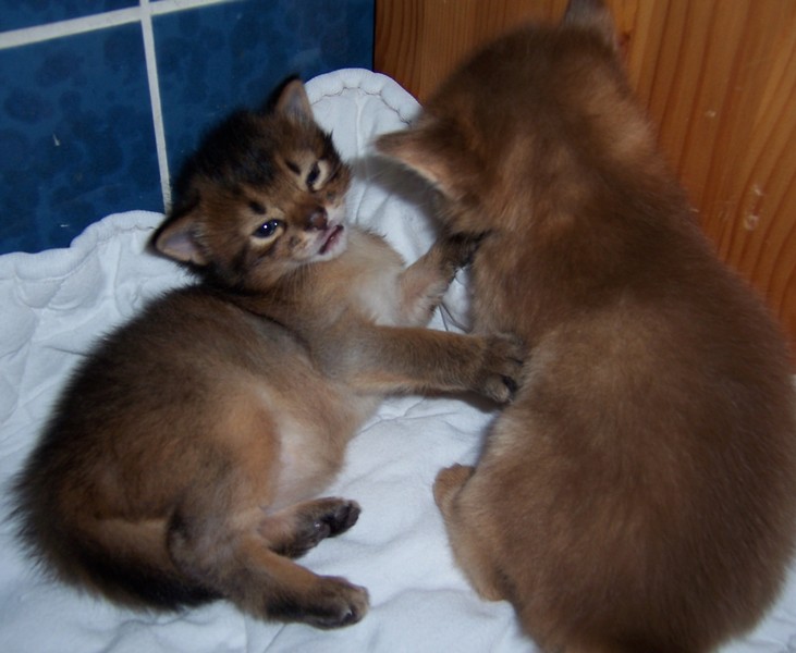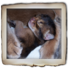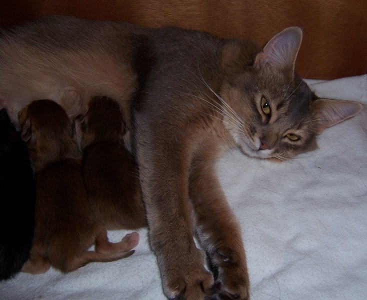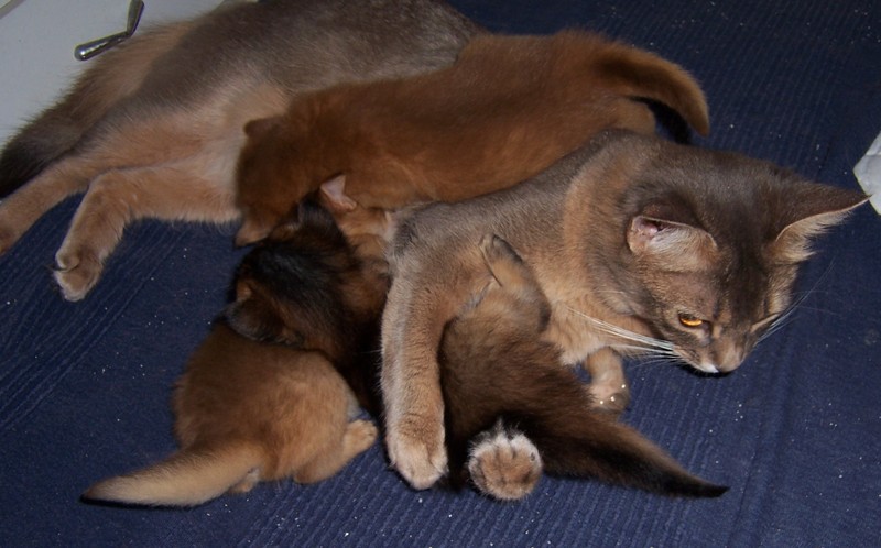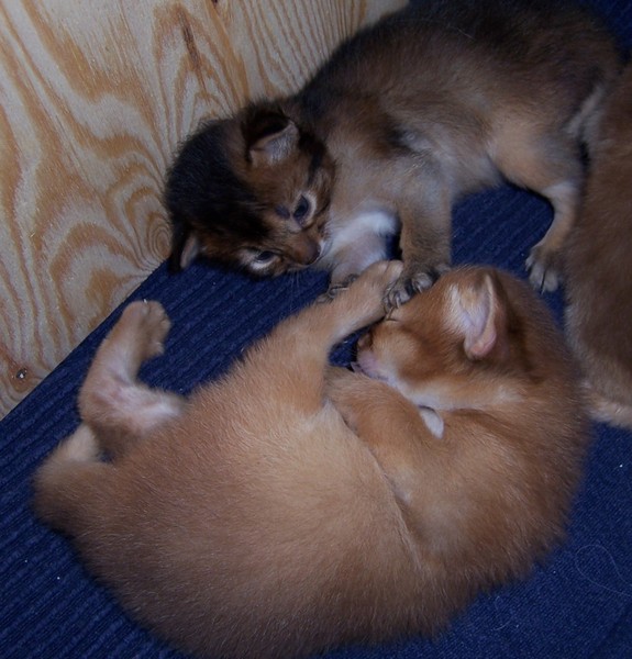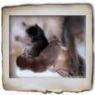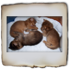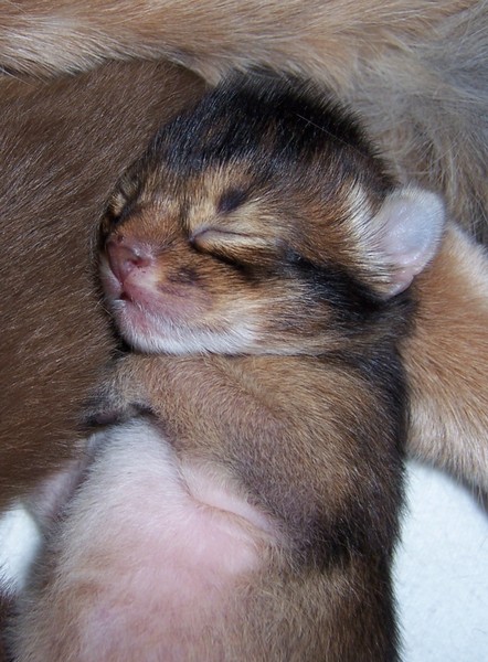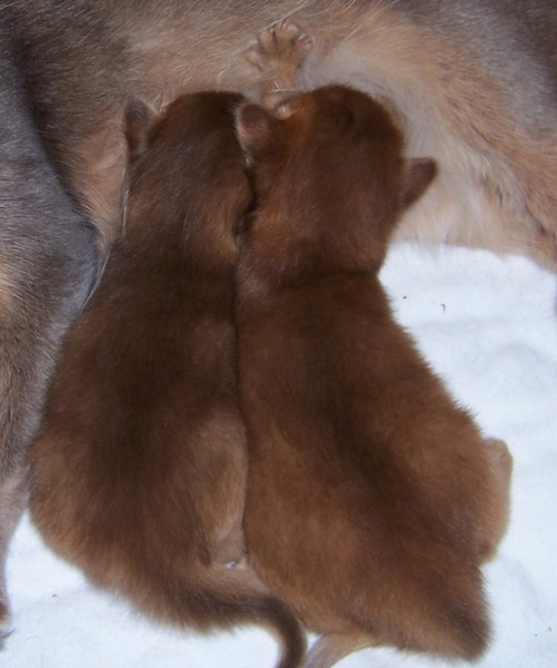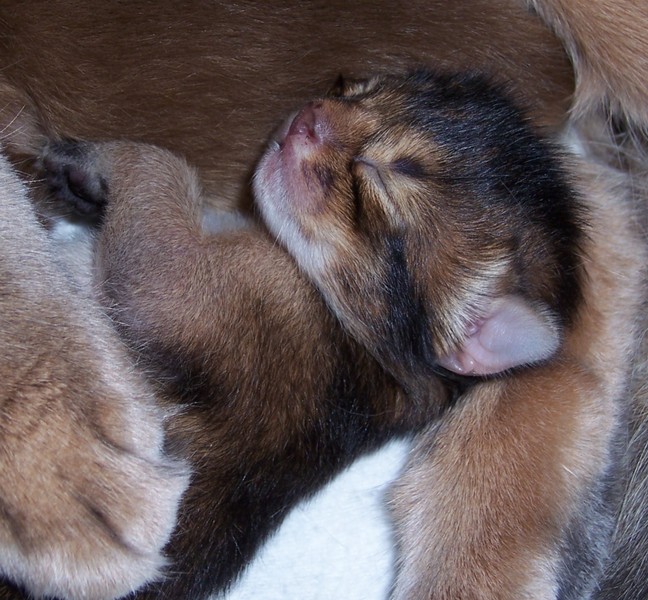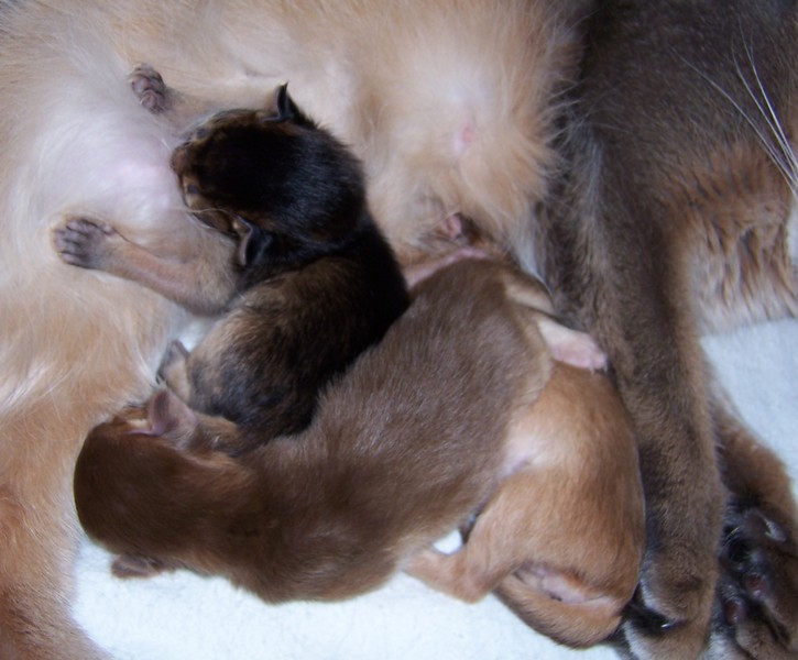 Die Babys wachsen und gedeihen sehr gut. Der wildfarbene Kater hatte recht schnell seinen sorrel Bruder gewichtsmäßig nicht nur eingeholt, sondern auch noch überholt. Aber Beide kommen an Mr. Schwergewicht nicht ran. So haben mit 3 Wochen und 3 Tagen Mr. Wildfarben und Mr. Sorrel um die 420 g, während Mr. Schwergewicht schon 492 g auf den Rippen hat. Bis die Babys zwei Wochen alt waren, floss die Milch ziemlich gut. Da Indi aber dann ständig versuchte Enya zu decken, obwohl sie sichtbar (noch) nicht rollte, sie sich das aber gefallen lies, dass er auf ihr rumstiefelte, sah ich mich dann gezwungen, ihr die Pille zu geben. Seit dem kämpfen die Babys um ihre Milch und die Gewichte schwanken recht stark.