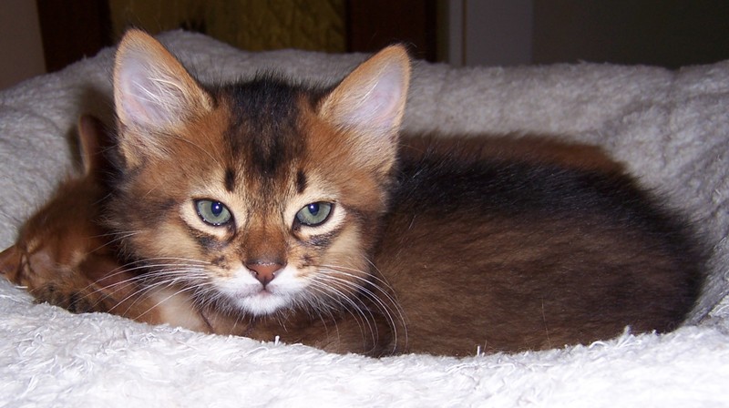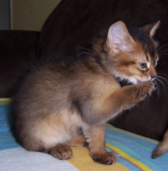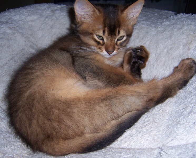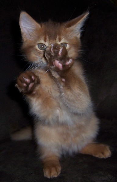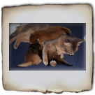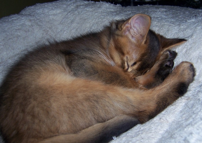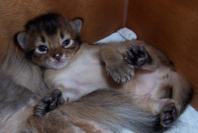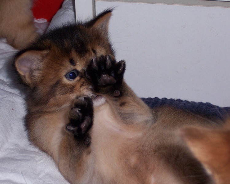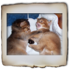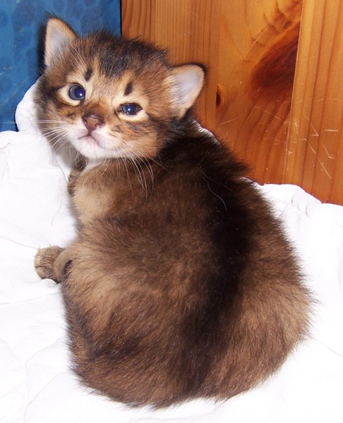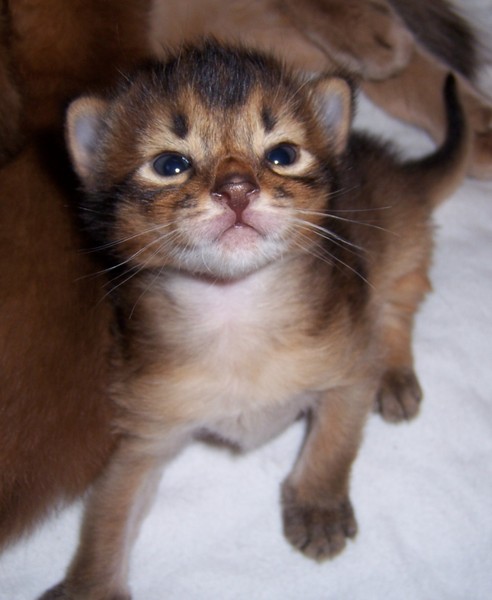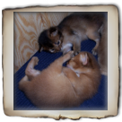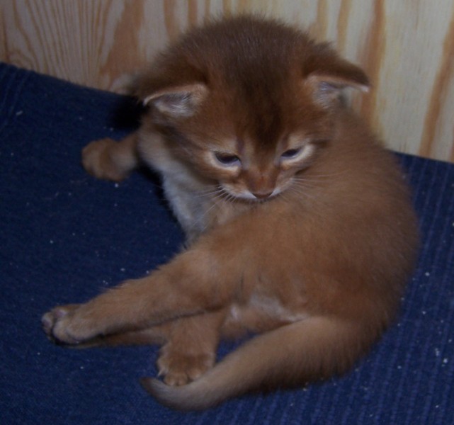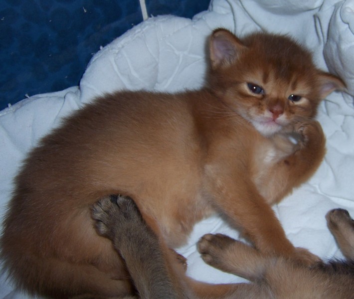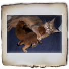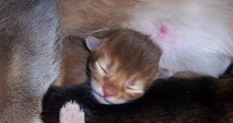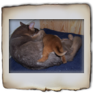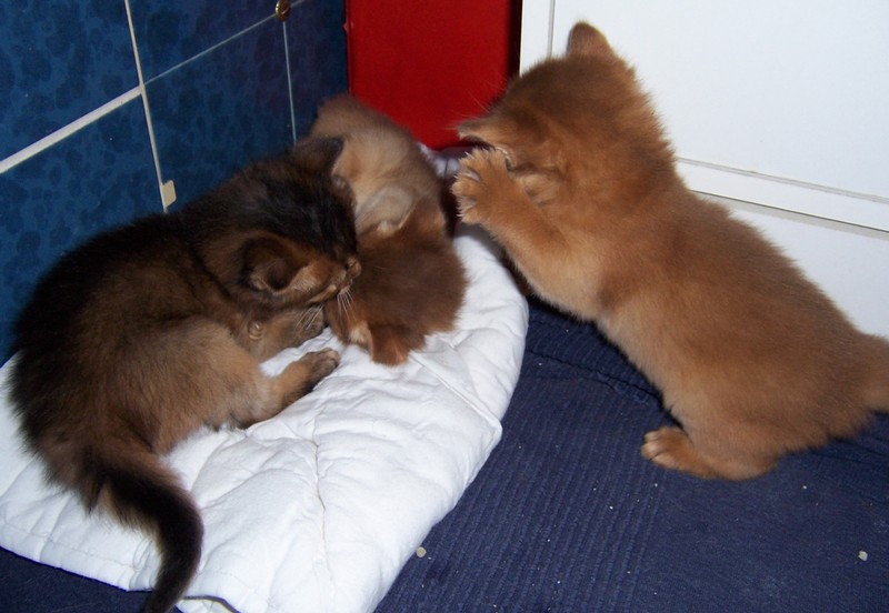 Die Babys wachsen und gedeihen sehr gut. Der wildfarbene Kater hatte recht schnell seinen sorrel Bruder gewichtsmäßig nicht nur eingeholt, sondern auch noch überholt. Aber Beide kommen an Mr. Schwergewicht nicht ran. So haben mit 3 Wochen und 3 Tagen Mr. Wildfarben und Mr. Sorrel um die 420 g, während Mr. Schwergewicht schon 492 g auf den Rippen hat. Bis die Babys zwei Wochen alt waren, floss die Milch ziemlich gut. Da Indi aber dann ständig versuchte Enya zu decken, obwohl sie sichtbar (noch) nicht rollte, sie sich das aber gefallen lies, dass er auf ihr rumstiefelte, sah ich mich dann gezwungen, ihr die Pille zu geben. Seit dem kämpfen die Babys um ihre Milch und die Gewichte schwanken recht stark.