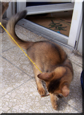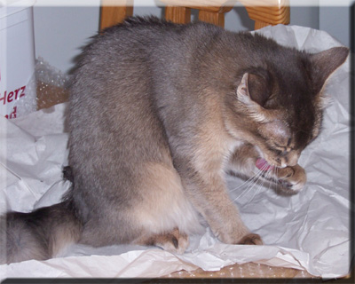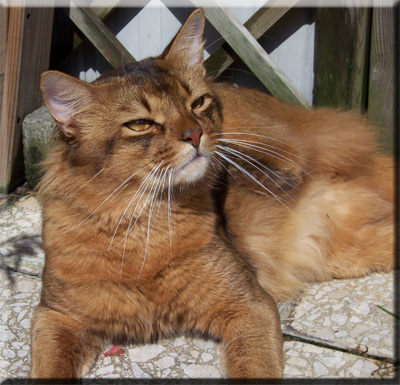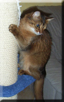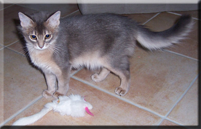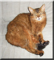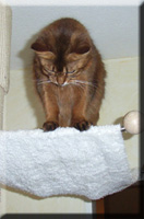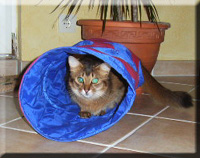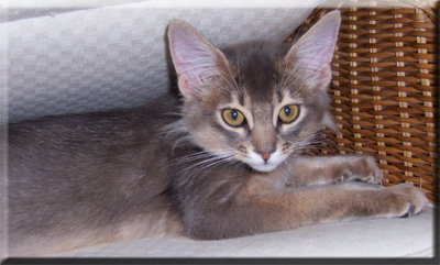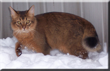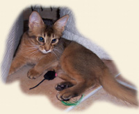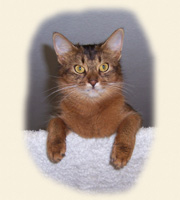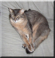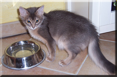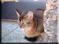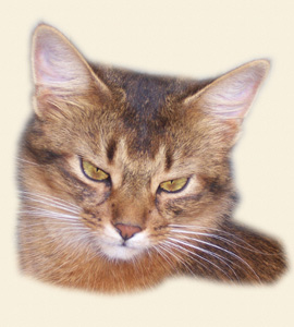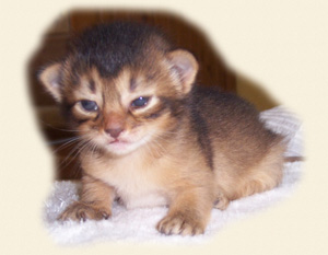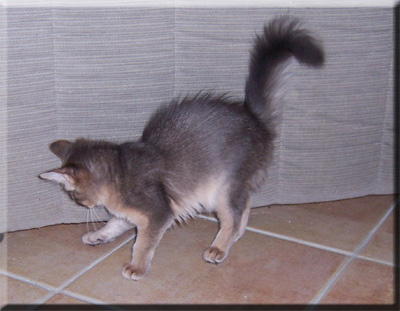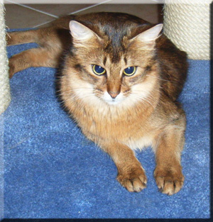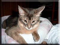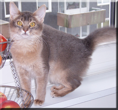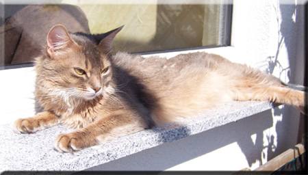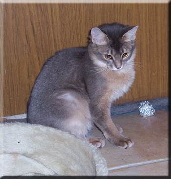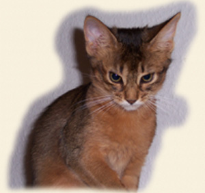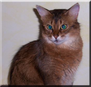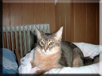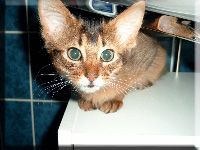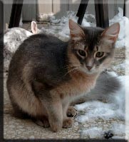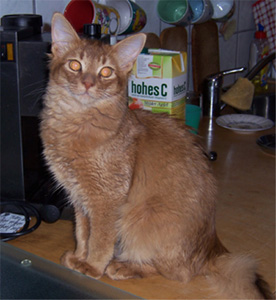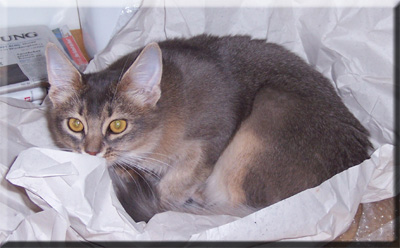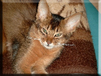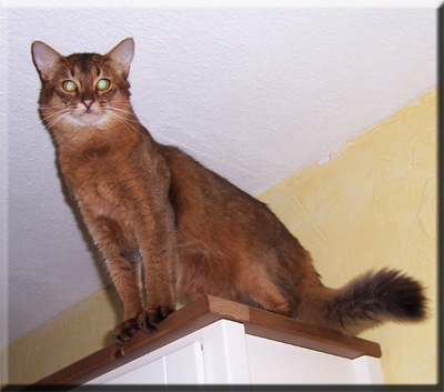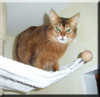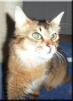 Gladys ist eine wildfarbene Somali. Sie hat von ihrem Papa die schönen Ohrpinselchen vererbt bekommen. Wer Purrkin's Baby Witch kennt, der weiß, warum sie "schnutig" aussieht. Sie ist unsere Prinzessin auf der Erbse, tut immer geheimnisvoll und wirkt über alles erhaben. Zum Schmusen kommt die "Grande Dame" äußerst selten.