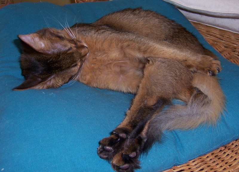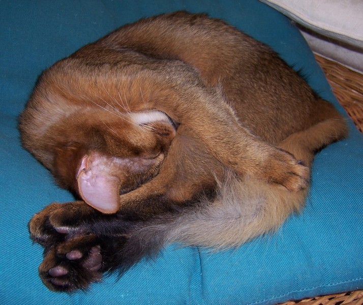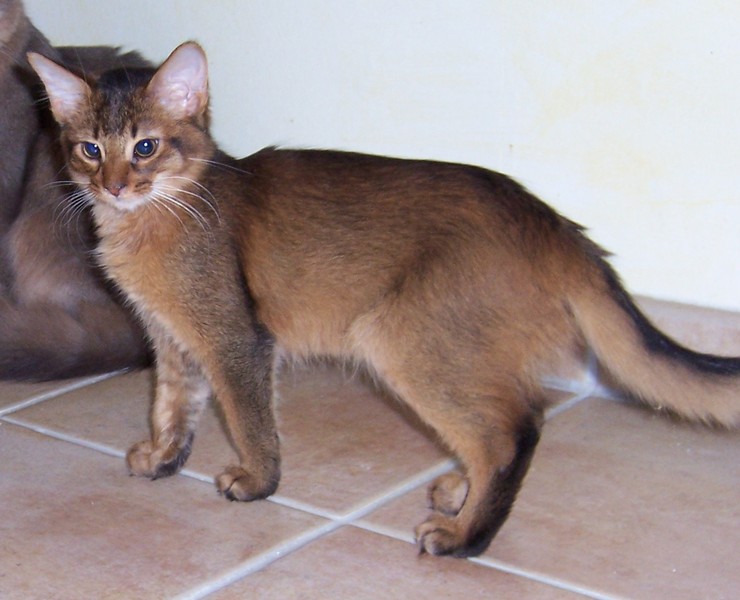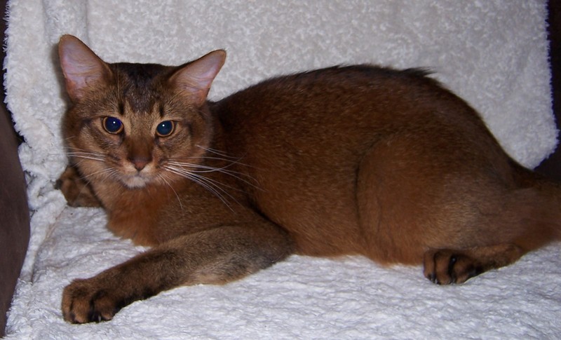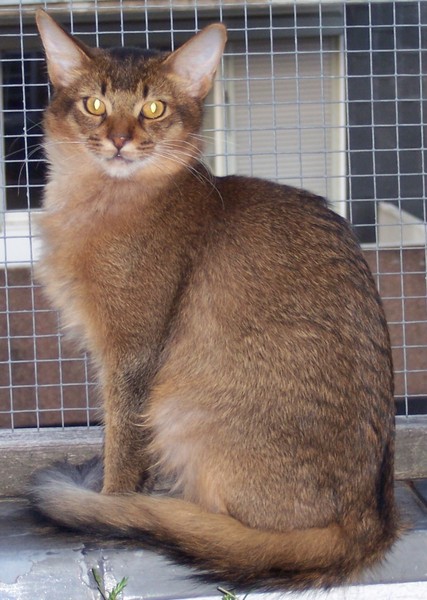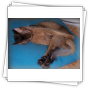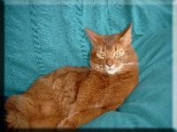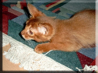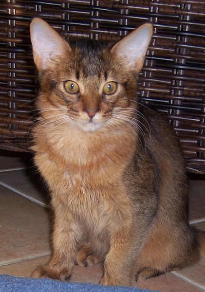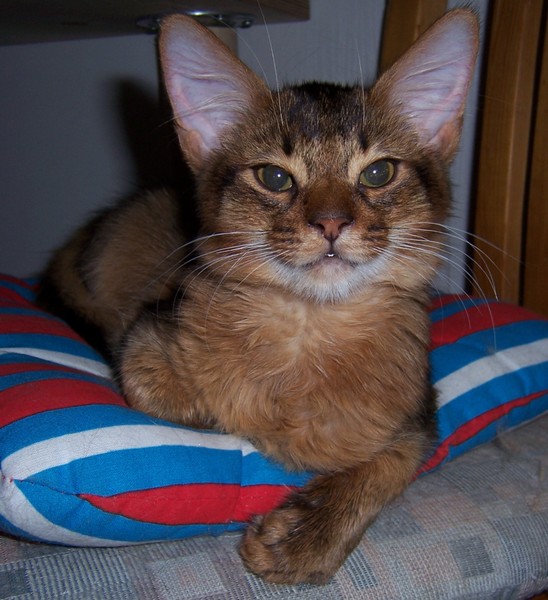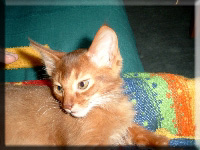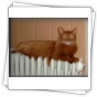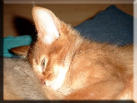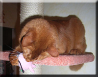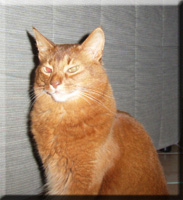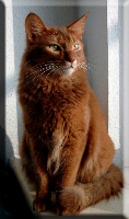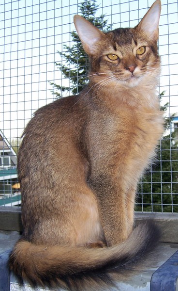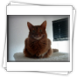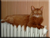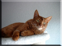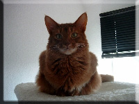 Fenny ist Simones Liebling. Er hat, wie auch seine Schwester, die schönen Ohrpinselchen. Sein wahnsinns Fell leuchtet glühend sorrel. Mir ist noch keine Katze begegnet, die mehr Mimik hat als er. Unglaublich, was man in seinem süßen Gesichtchen alles "lesen" kann. Aber er hat es auch faustdick hinter den Ohren. Im Blödsinnmachen ist er allen anderen weit überlegen. Auf Ausstellungen nehmen wir ihn gerne mit, da seine überaus ruhige Art während der Fahrt und auch im Käfig auf die anderen Katzen ausstrahlt. Mit ihm war nie beabsichtigt zu züchten. Er hat nur einen "Beruf": Liebhabertier.