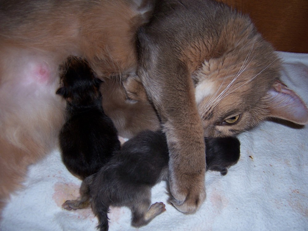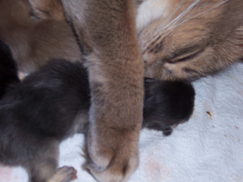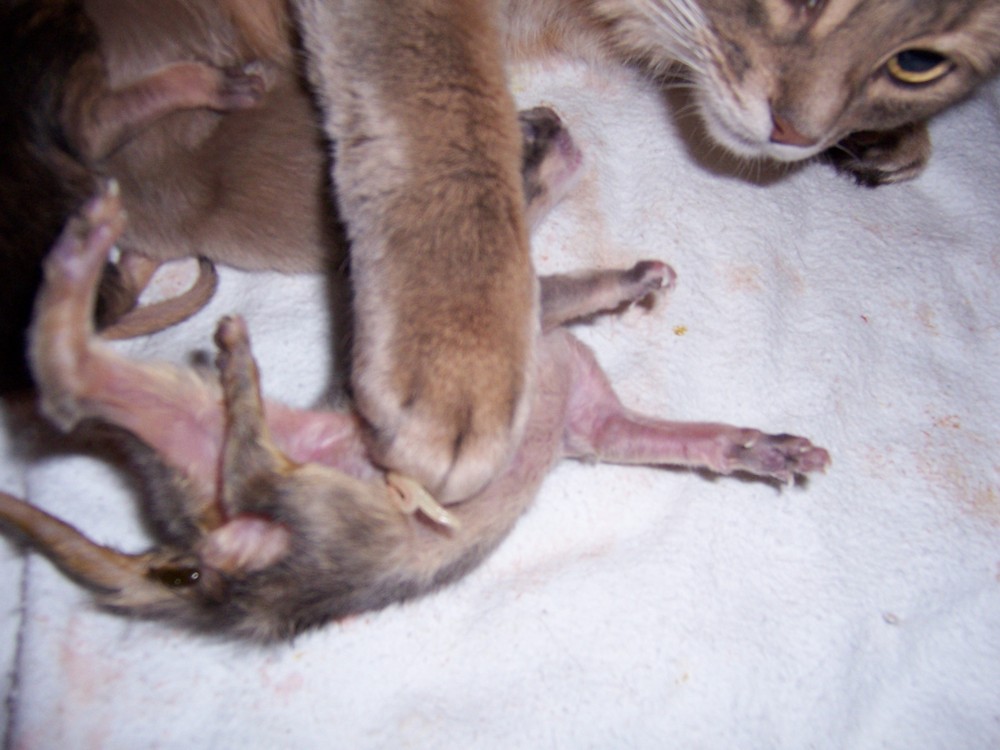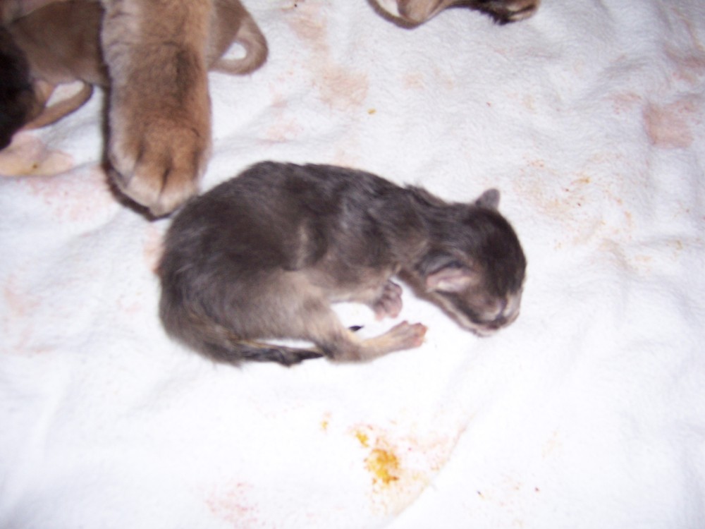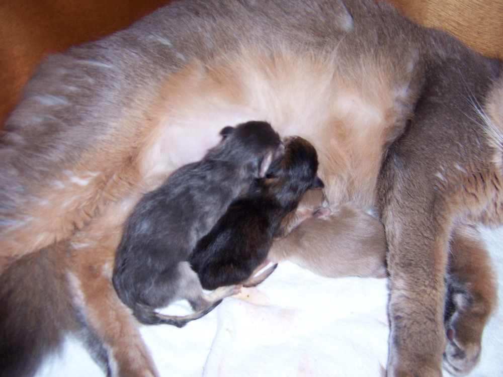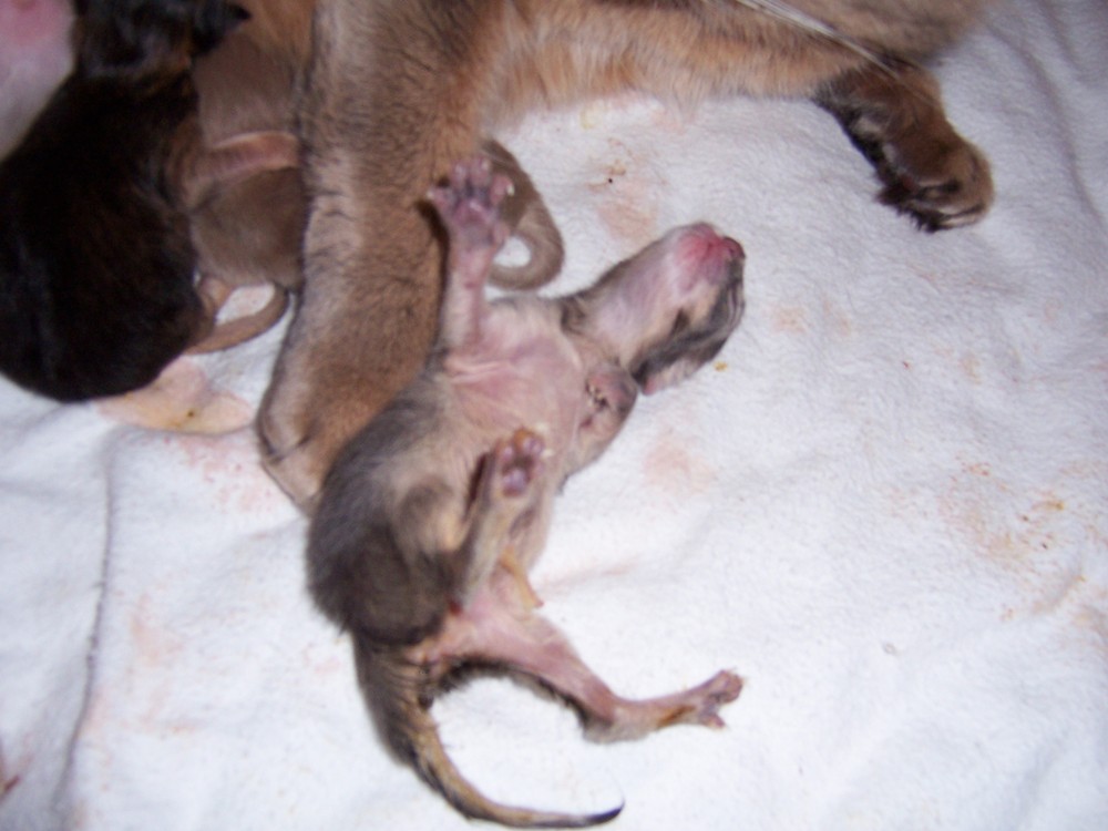 Es muss gegen 8.00 Uhr morgens gewesen sein, als ich dann die ersten Wehen mitbekam. Tatsächlich hat es aber dann noch bis 9.34 Uhr gedauert bis sich ein fawnfarbenes Mädel den Weg auf die Welt erkämpfte unter lautstarkem Geschrei ihrer Mama, die mir beinahe aus der Kiste gesprungen wäre, hätte ich sie nicht daran gehindert. Die Kleine war ziemlich erschöpft von der Geburt und brauchte recht lange, um bei einer Zitze anzudocken. Enya hat der Weil auch eine Pause gemacht. Erst um 12.01 Uhr kam wieder unter lautem Geschrei von Enya ein wildfarbener Kater zur Welt. Für unsere Verhältnisse sogar recht leicht mit nur 86 g. Bin ich doch da ganz andere Gewichte gewohnt. Auch dieser junge Mann musste sich von der Geburt erholen. So, das war es -