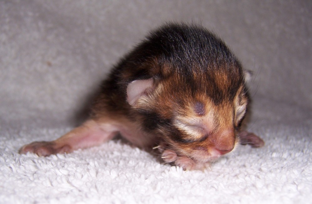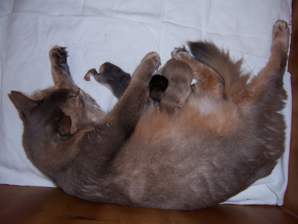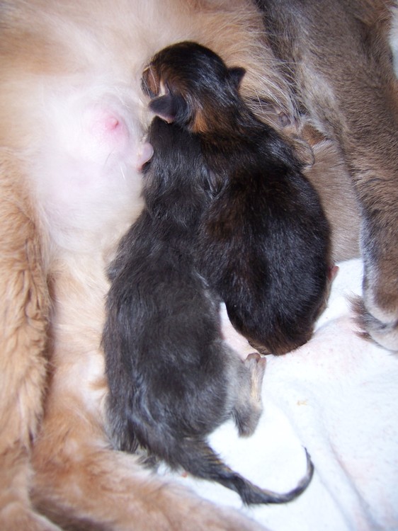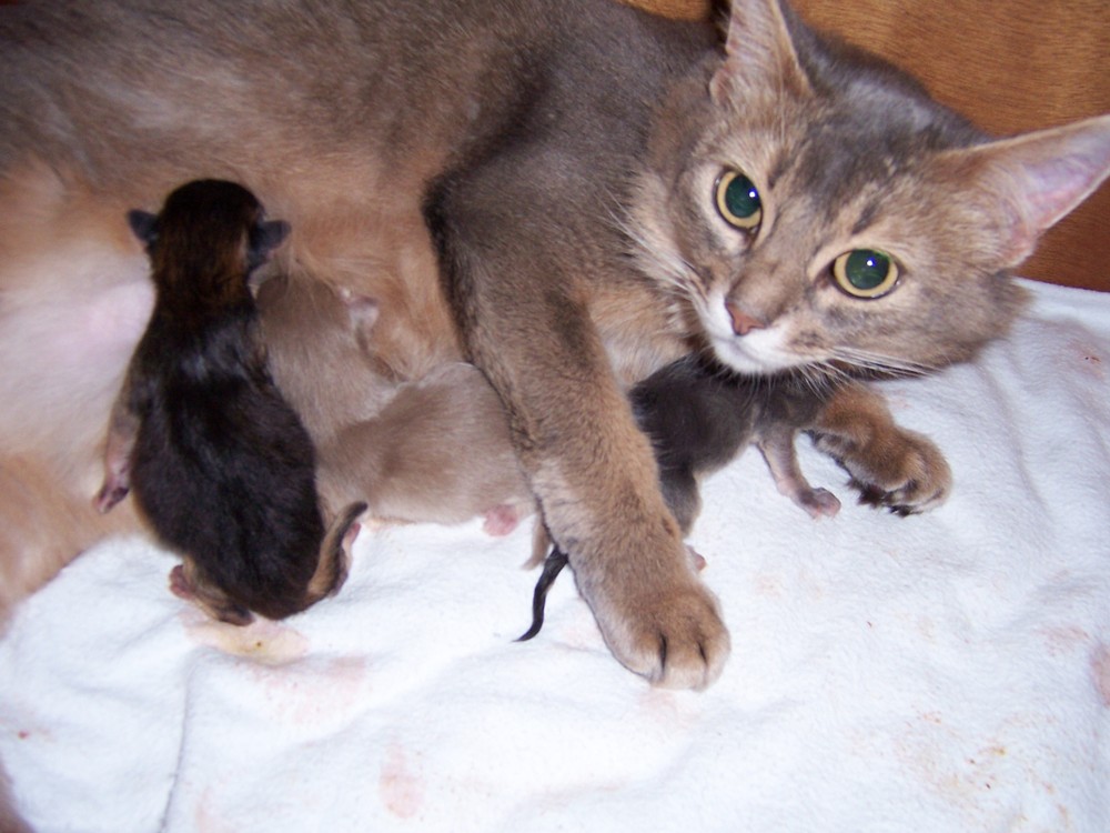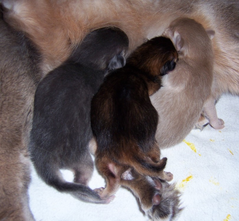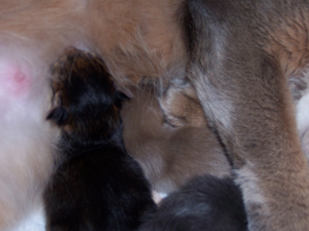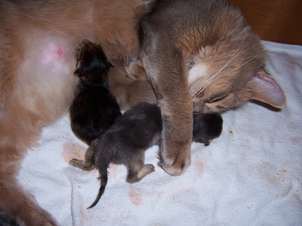 Es muss gegen 8.00 Uhr morgens gewesen sein, als ich dann die ersten Wehen mitbekam. Tatsächlich hat es aber dann noch bis 9.34 Uhr gedauert bis sich ein fawnfarbenes Mädel den Weg auf die Welt erkämpfte unter lautstarkem Geschrei ihrer Mama, die mir beinahe aus der Kiste gesprungen wäre, hätte ich sie nicht daran gehindert. Die Kleine war ziemlich erschöpft von der Geburt und brauchte recht lange, um bei einer Zitze anzudocken. Enya hat der Weil auch eine Pause gemacht. Erst um 12.01 Uhr kam wieder unter lautem Geschrei von Enya ein wildfarbener Kater zur Welt. Für unsere Verhältnisse sogar recht leicht mit nur 86 g. Bin ich doch da ganz andere Gewichte gewohnt. Auch dieser junge Mann musste sich von der Geburt erholen. So, das war es -