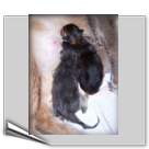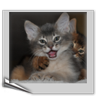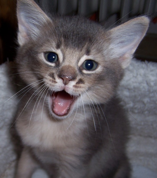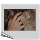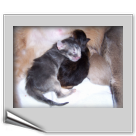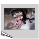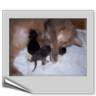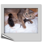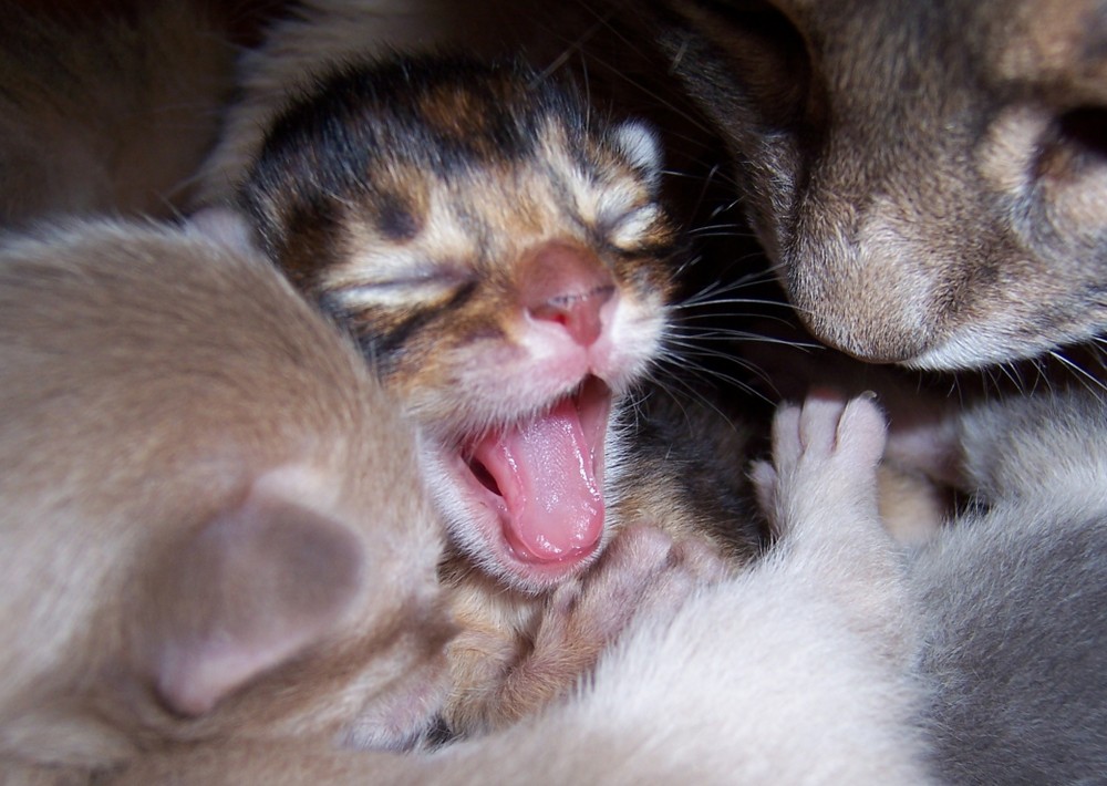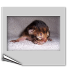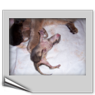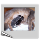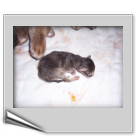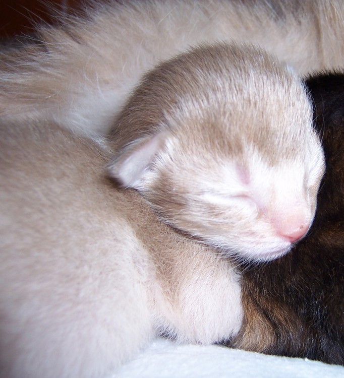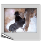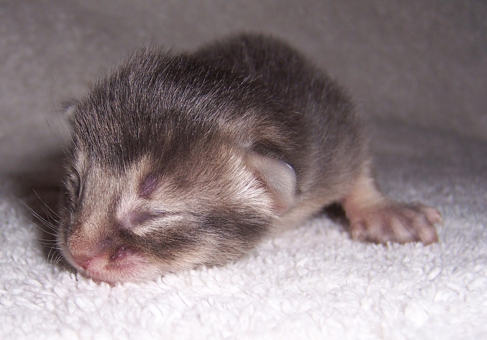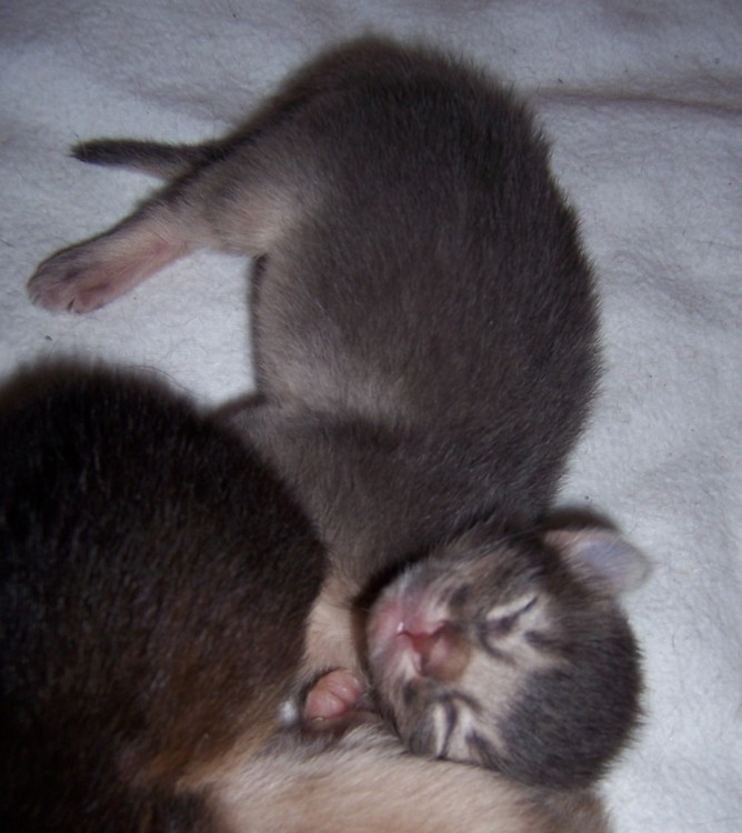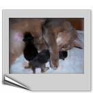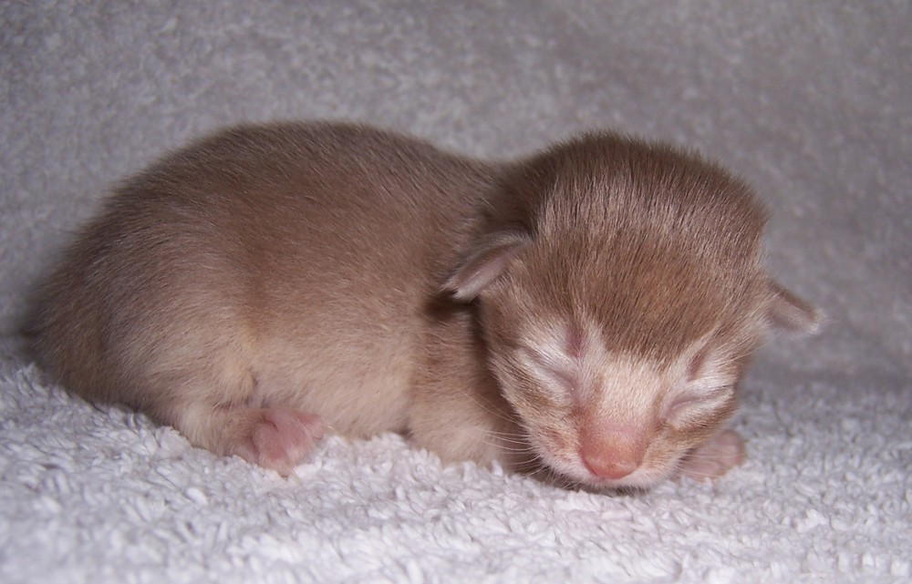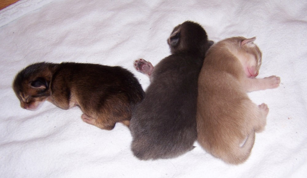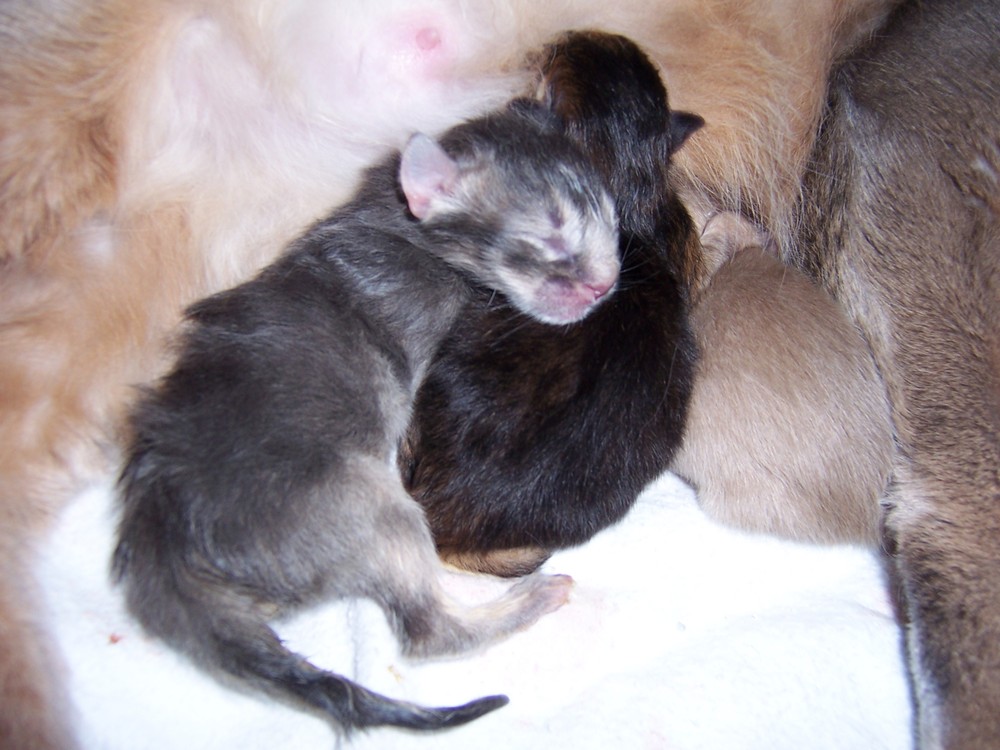 Es muss gegen 8.00 Uhr morgens gewesen sein, als ich dann die ersten Wehen mitbekam. Tatsächlich hat es aber dann noch bis 9.34 Uhr gedauert bis sich ein fawnfarbenes Mädel den Weg auf die Welt erkämpfte unter lautstarkem Geschrei ihrer Mama, die mir beinahe aus der Kiste gesprungen wäre, hätte ich sie nicht daran gehindert. Die Kleine war ziemlich erschöpft von der Geburt und brauchte recht lange, um bei einer Zitze anzudocken. Enya hat der Weil auch eine Pause gemacht. Erst um 12.01 Uhr kam wieder unter lautem Geschrei von Enya ein wildfarbener Kater zur Welt. Für unsere Verhältnisse sogar recht leicht mit nur 86 g. Bin ich doch da ganz andere Gewichte gewohnt. Auch dieser junge Mann musste sich von der Geburt erholen. So, das war es -