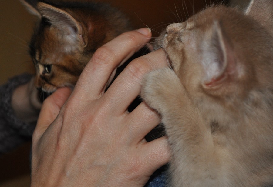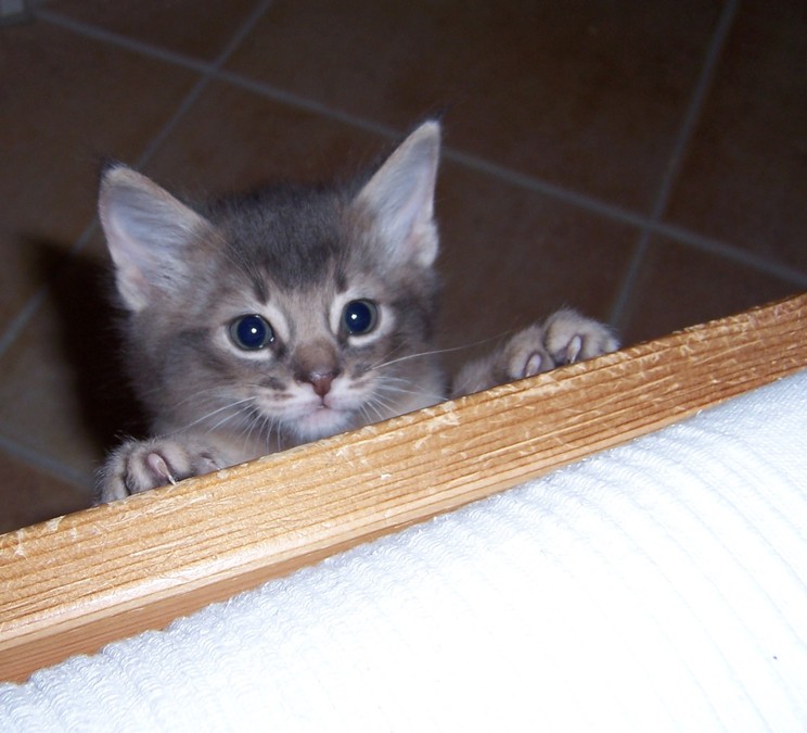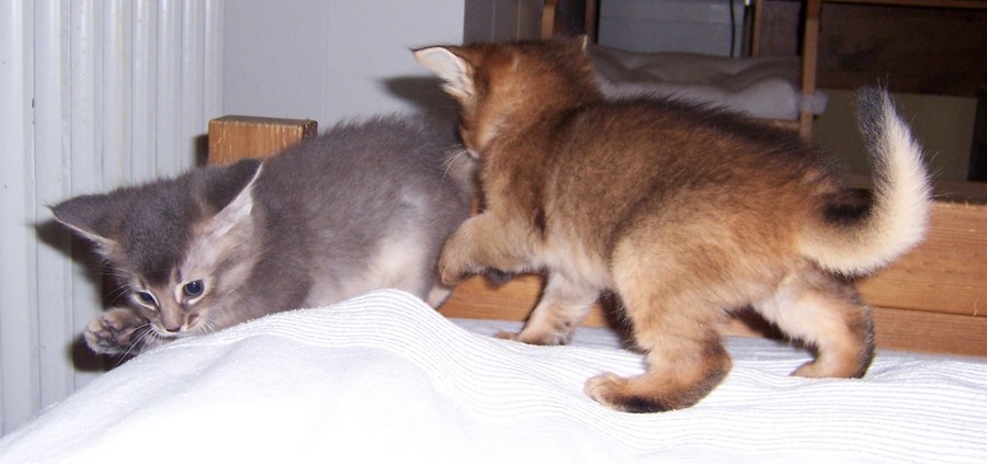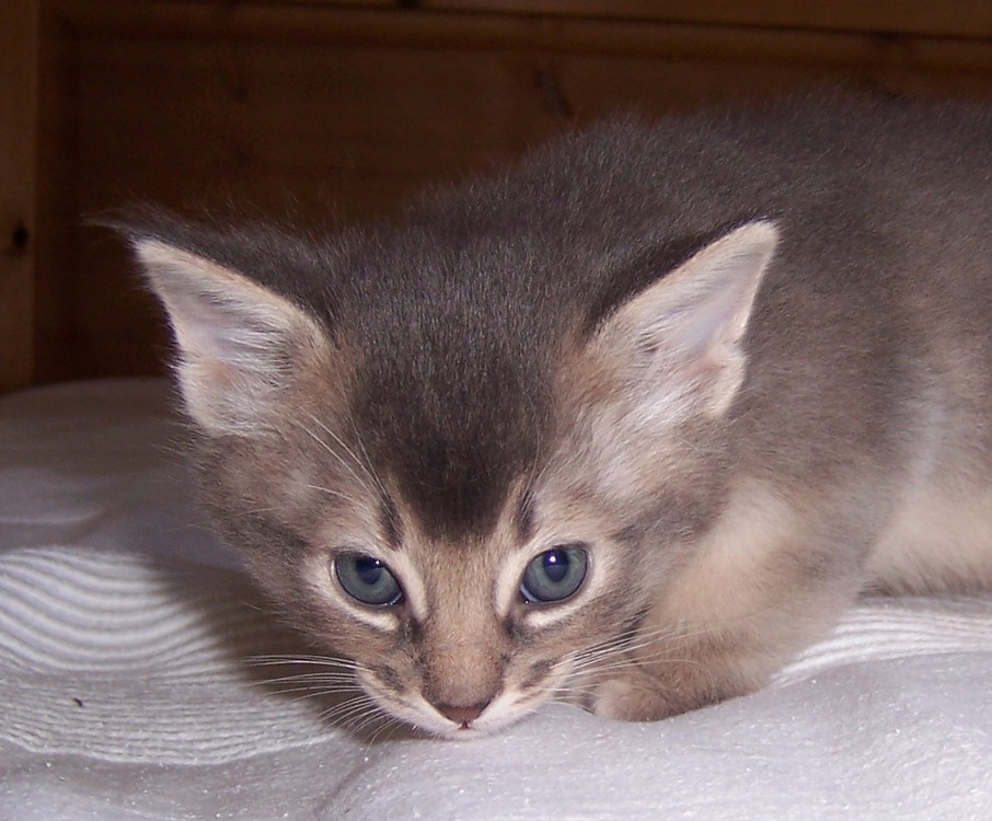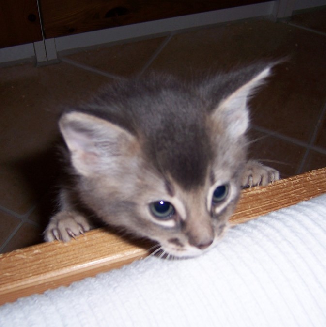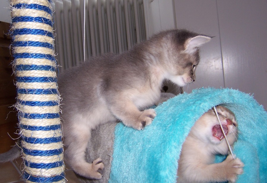 Turbulent waren die letzten Wochen. Enya hat nach 2 Wochen die Wurfkiste nicht mehr für sicher erachtet. War sie bis dahin noch damit einverstanden, dass ihre Mitkatzen sich in der Nähe der Kiste aufhalten, so war es ab sofort vorbei damit. Als ich abends nach Hause kam, kamen mir schon panische Katzen entgegen und weder Enya noch die Babies waren in der Kiste zu finden. Sie hatte die unterste Schublade meines Kleiderschrankes aufgezogen und die Kitten dorthin verschleppt. Enya fand das absolut toll, ich weniger. Die Wurfkiste akzeptierte sie gar nicht mehr. Ebenso wenig einen anderen Raum. Wir haben dann einen Kompromiss gefunden, in dem ich ihr den Bereich zwischen Bett und Kleiderschrank zurecht und für die Kitten ausbruchsicher gemacht habe. Das wurde dann akzeptiert. Keine andere Katze darf aber den Raum betreten, dann wird Enya zur Furie. So hat sie jetzt mit ihren Kitten einen knapp 30 qm Raum für sich in Anspruch und der Rest kann schauen, wie er klar kommt.